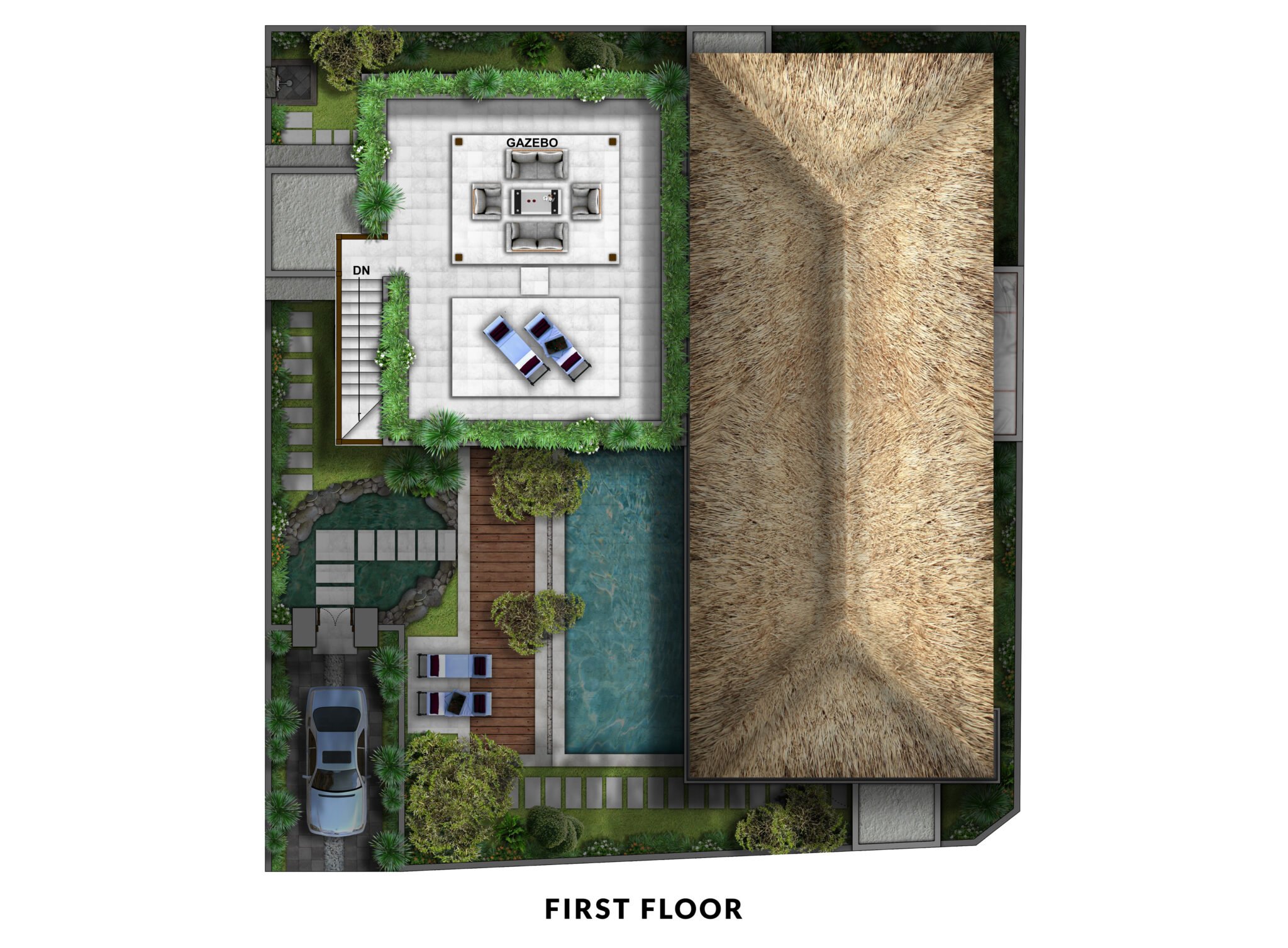 - Poolside gazebo with lounge chairs