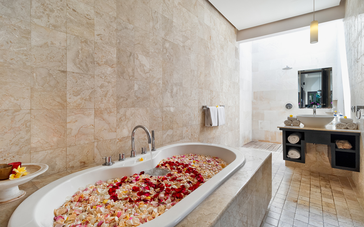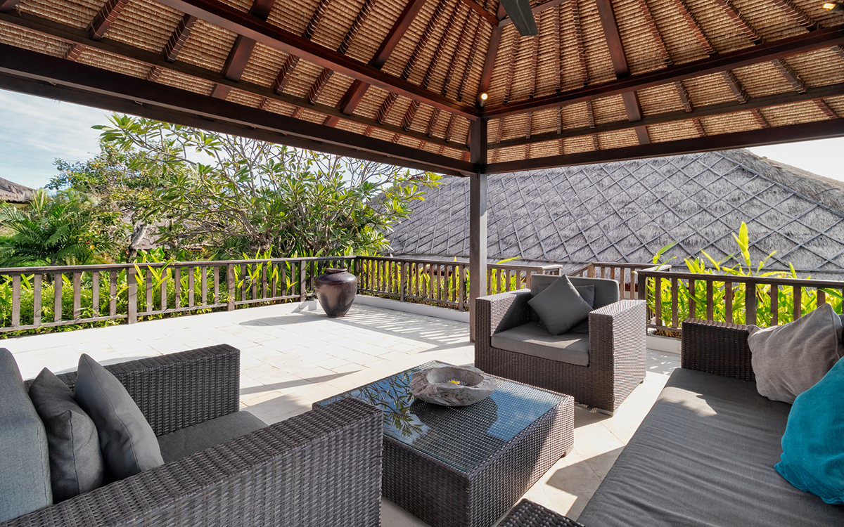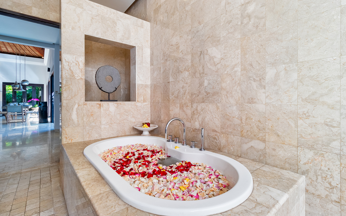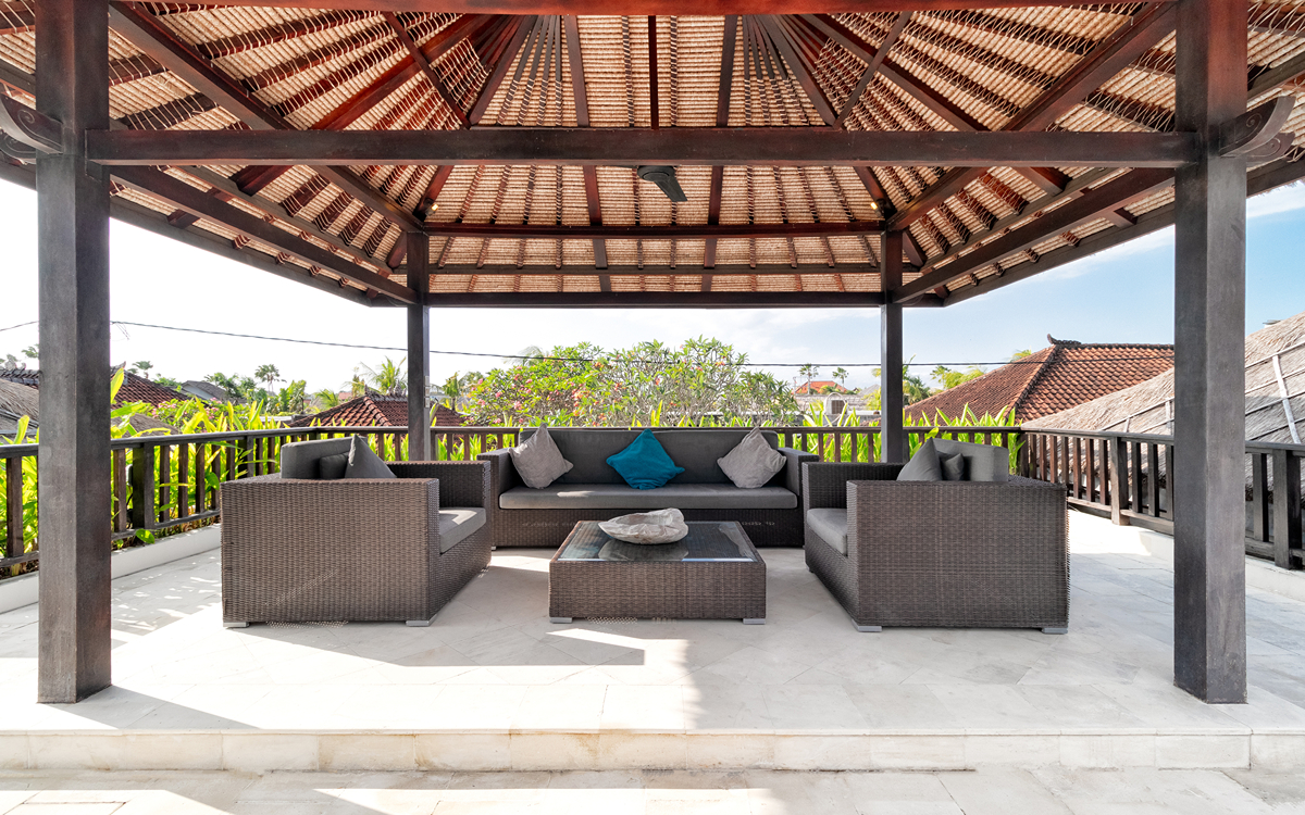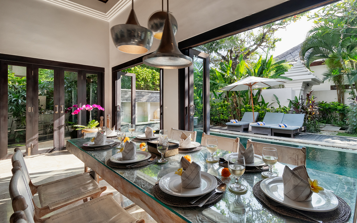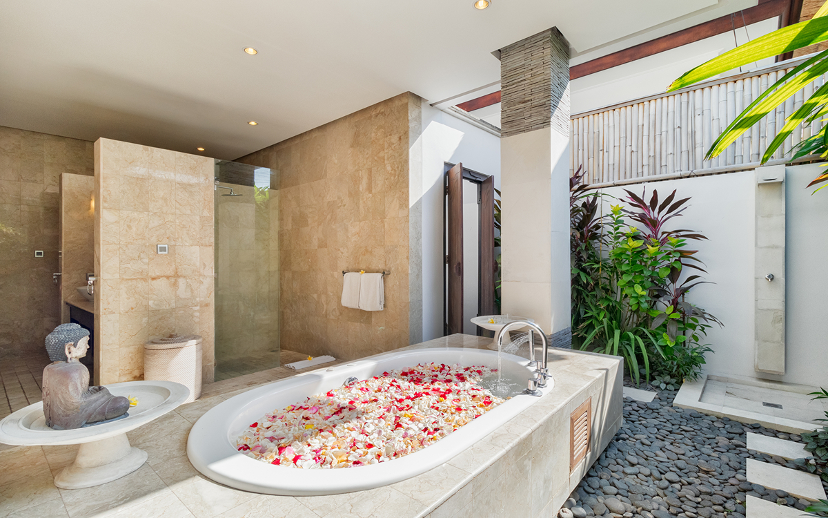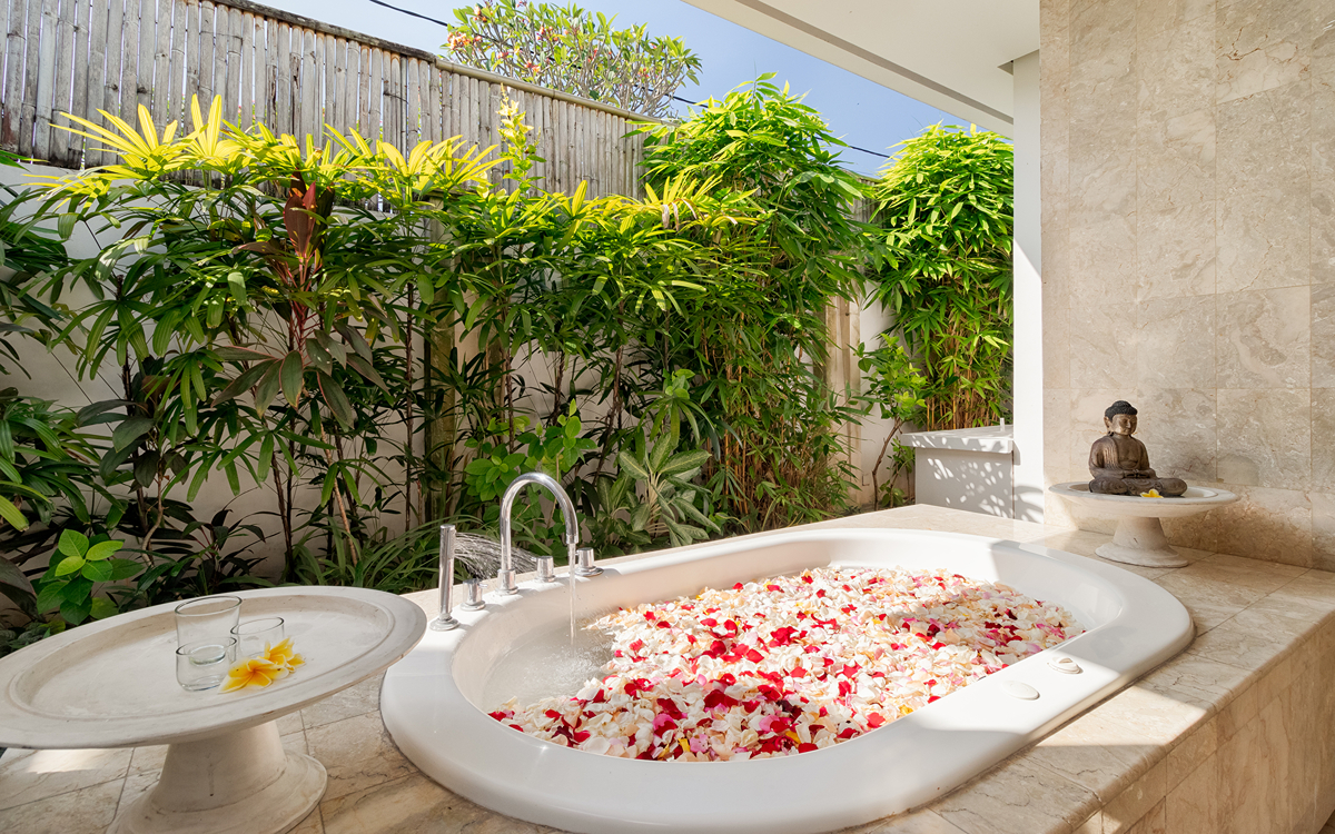 The outdoor setting is ideal for friends and family to enjoy each other’s company around the pool. Natural river stones, calming Buddhas, tropical greenery, and frangipani trees create an authentic Balinese vibe. Sit back on the sun lounges under the parasol’s shade and completely unwind in this Balinese paradise.