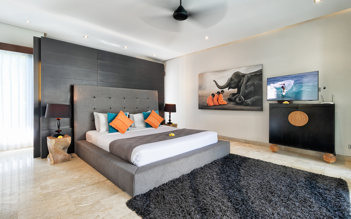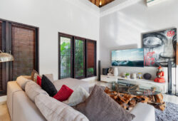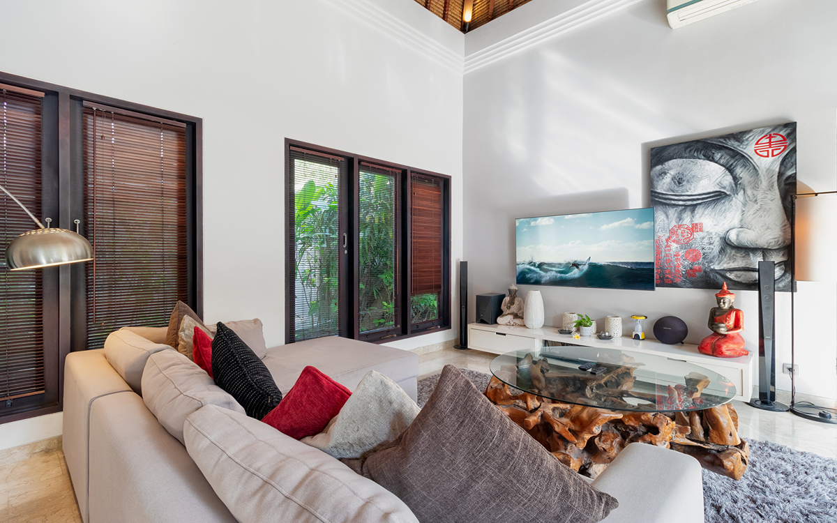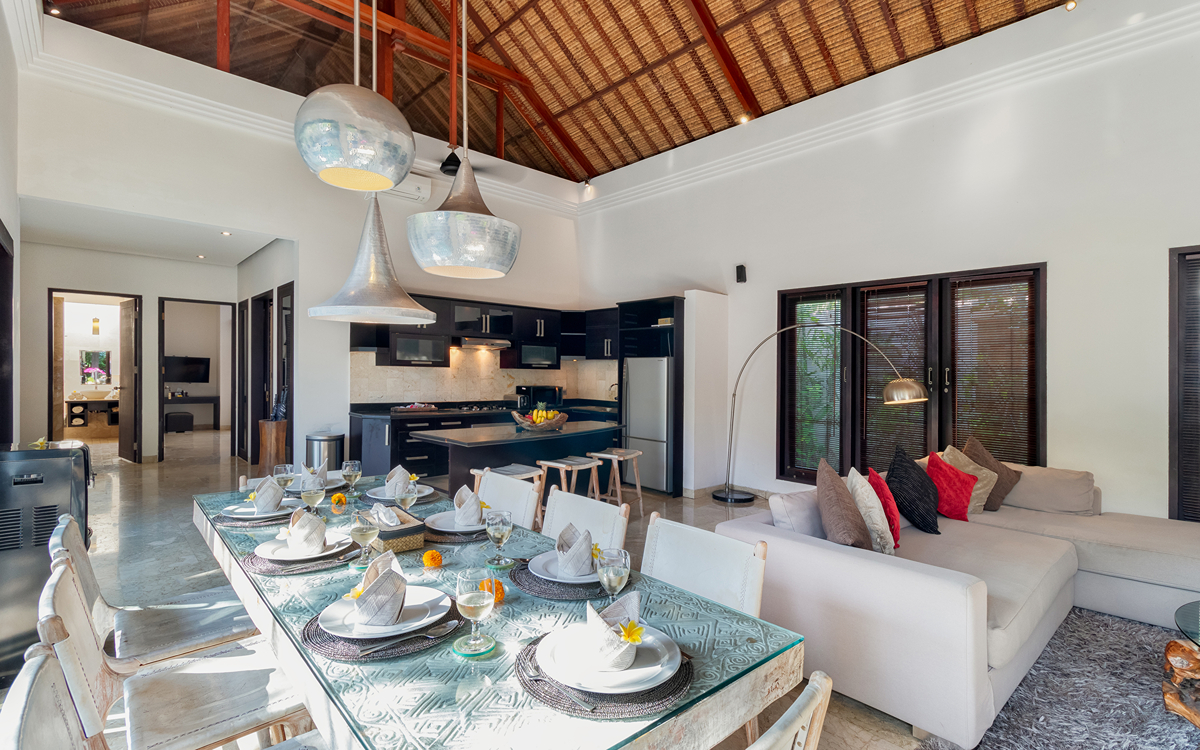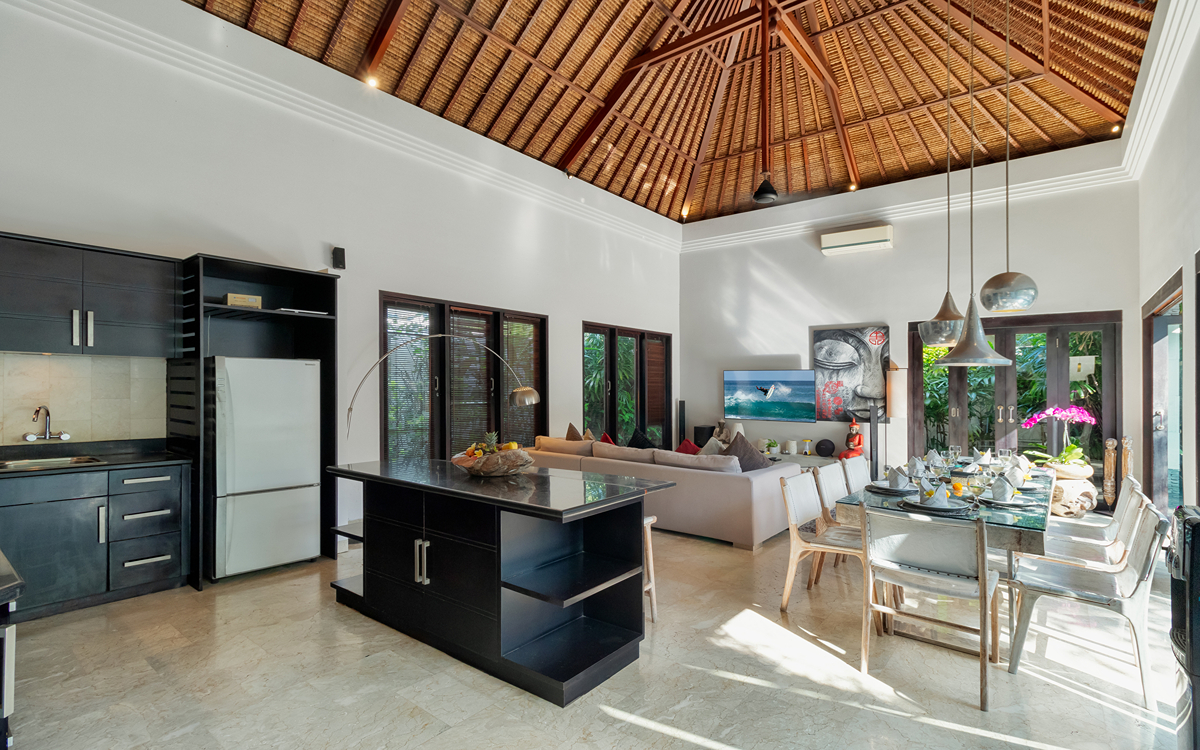 The living area has large bi-folding doors opening directly onto the pool and houses the kitchen, dining and lounge areas. Open the doors onto the pool for a more incredible tropical ambience, or relax in the comfort of air-conditioning. The furnishings are modern and chic, emphasising comfort and functionality. The sofa offers plenty of space for everyone to enjoy some TV time, the dining table seats 6, and the kitchen has every appliance you need.