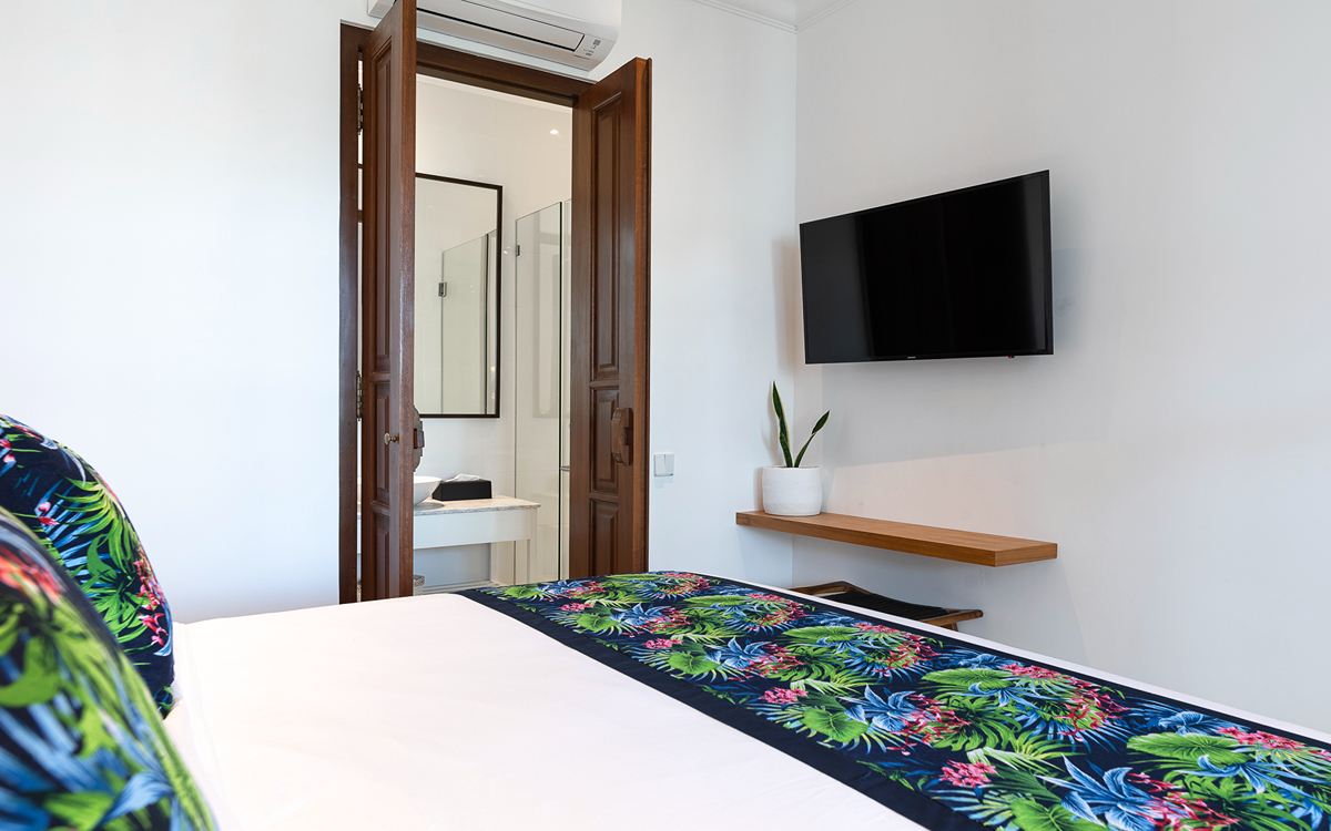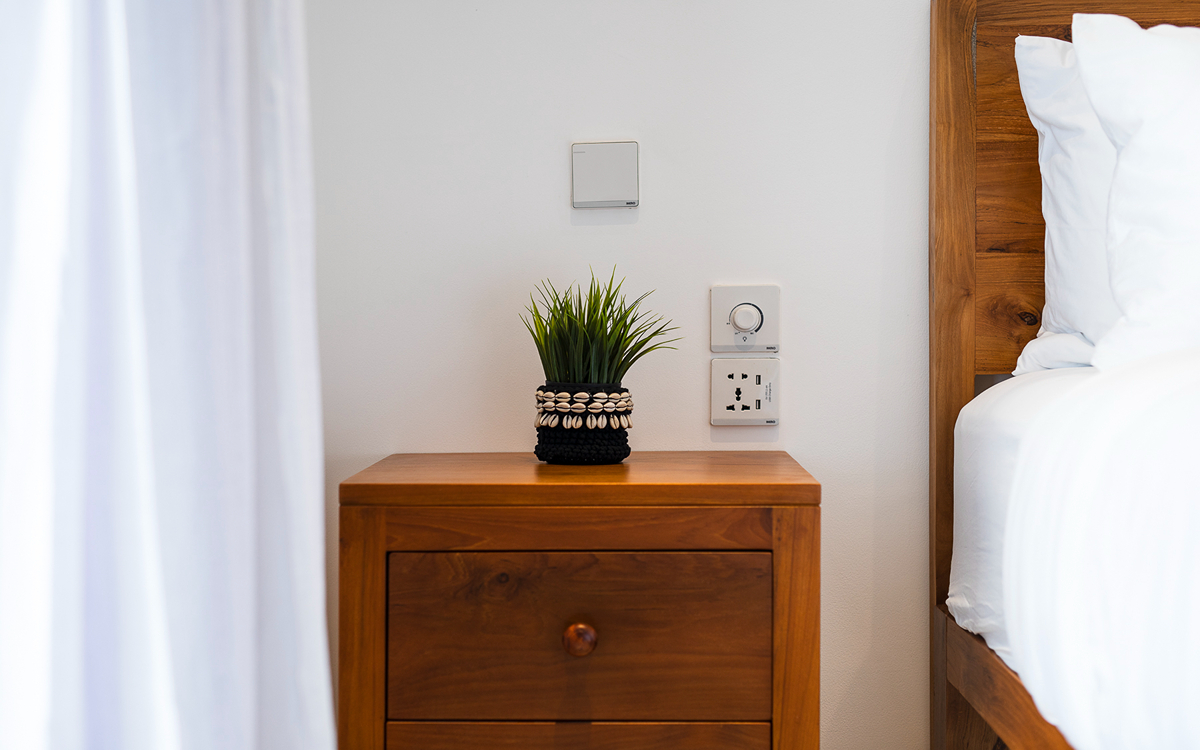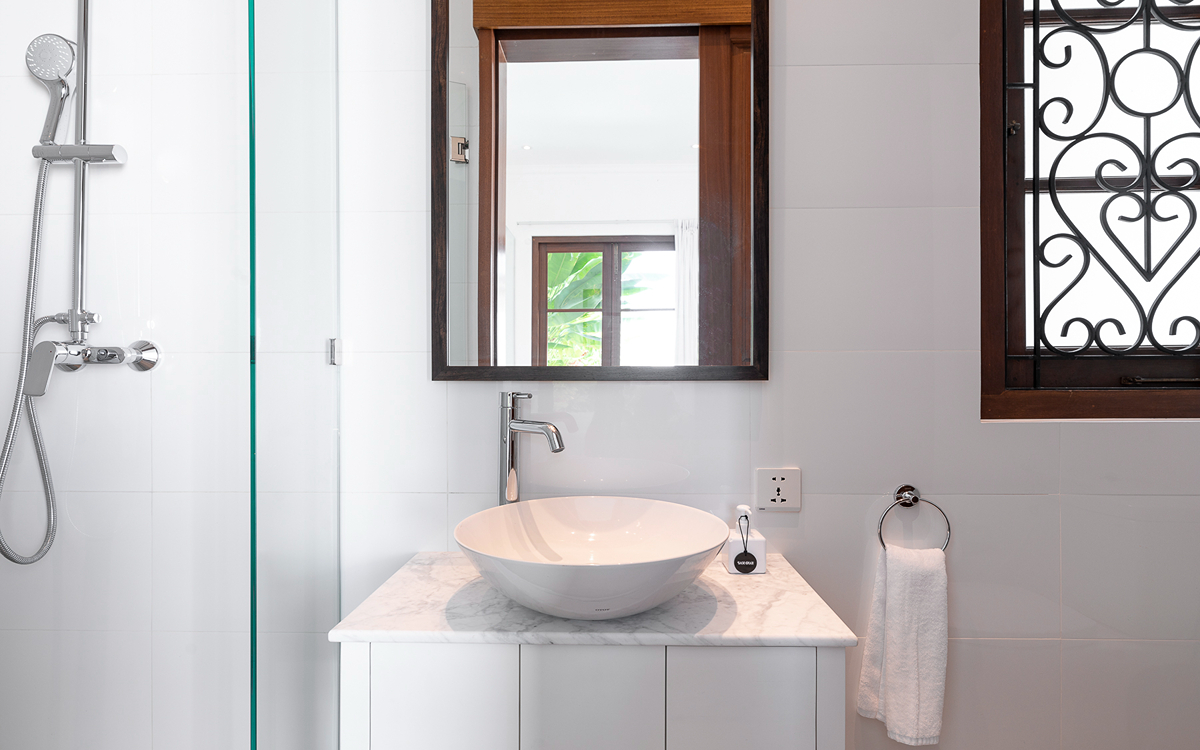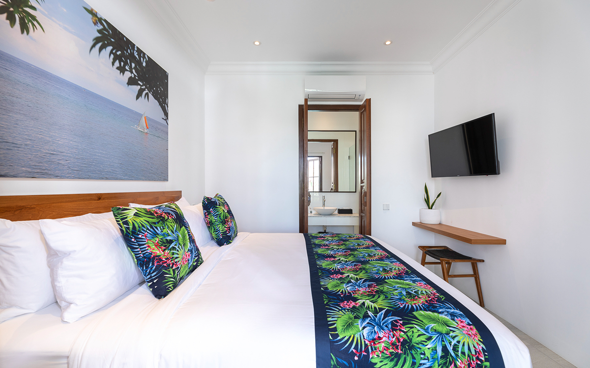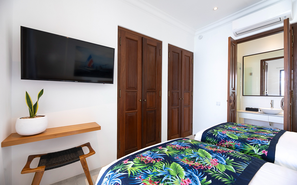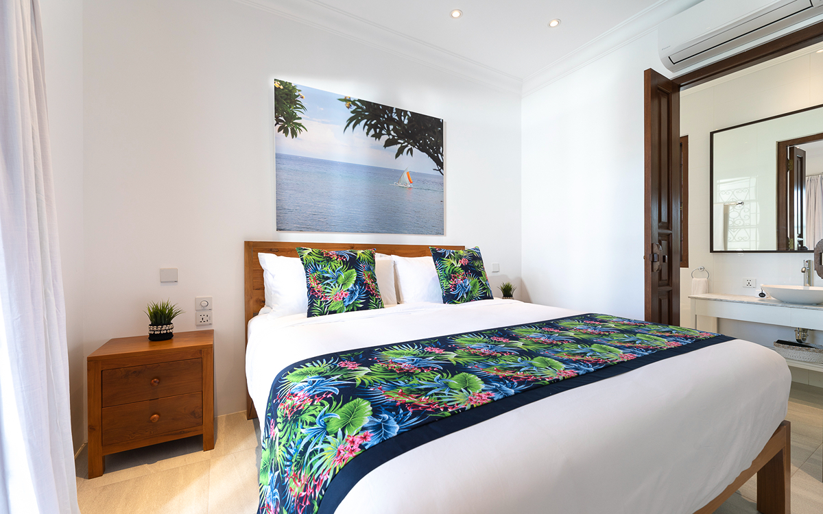 This villa features two bedrooms, each equipped with modern amenities to ensure a comfortable stay. One room has twin beds (great for kids), and the other has a single bed, air-conditioned, and ensuite bathrooms. Each bathroom is modern and comfortable, featuring a walk-in shower, toilet, and basin, providing all the amenities you need for a pampered stay. Enjoy the Smart TV (to catch up on all your Netflix) for entertainment. Each room also includes a wardrobe to store your belongings safely.
