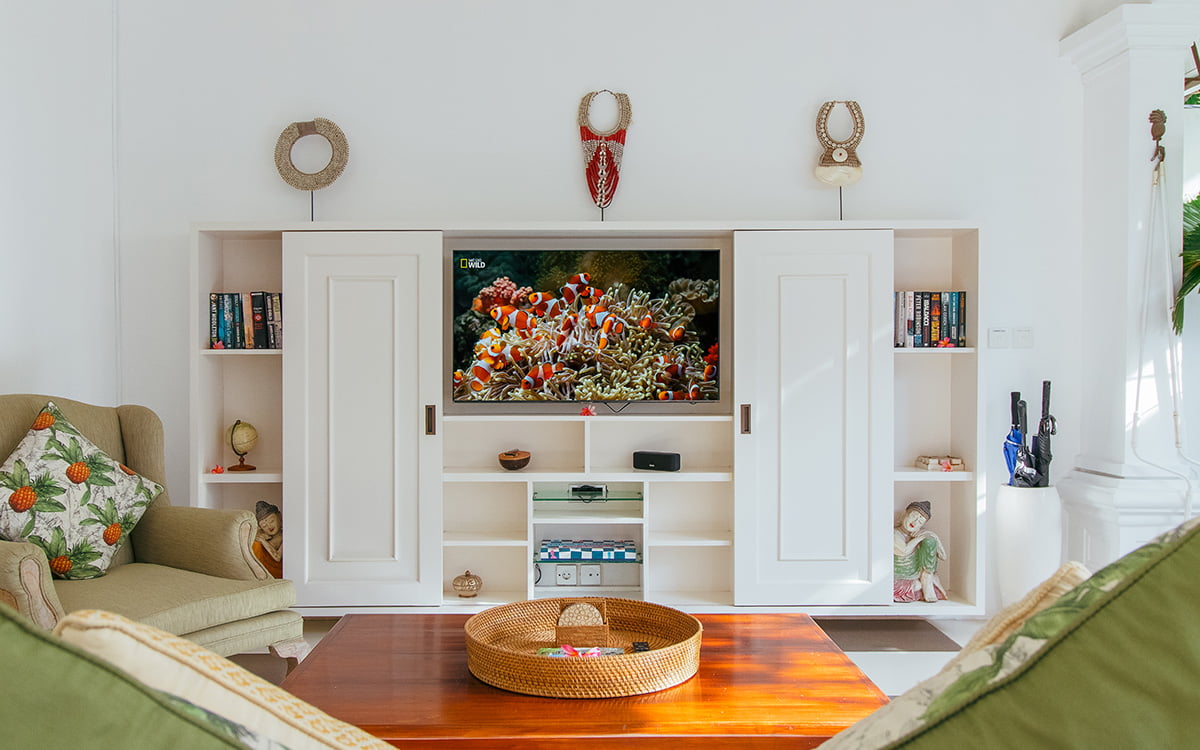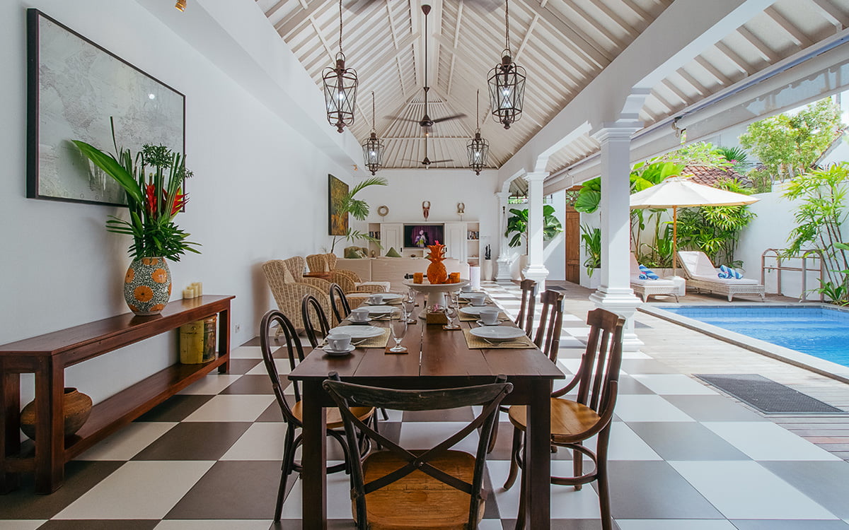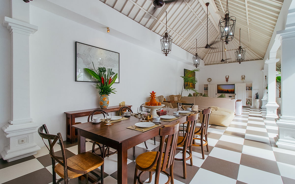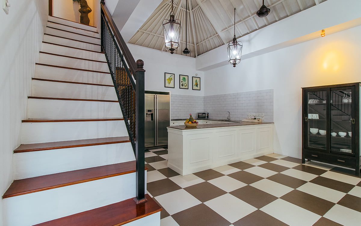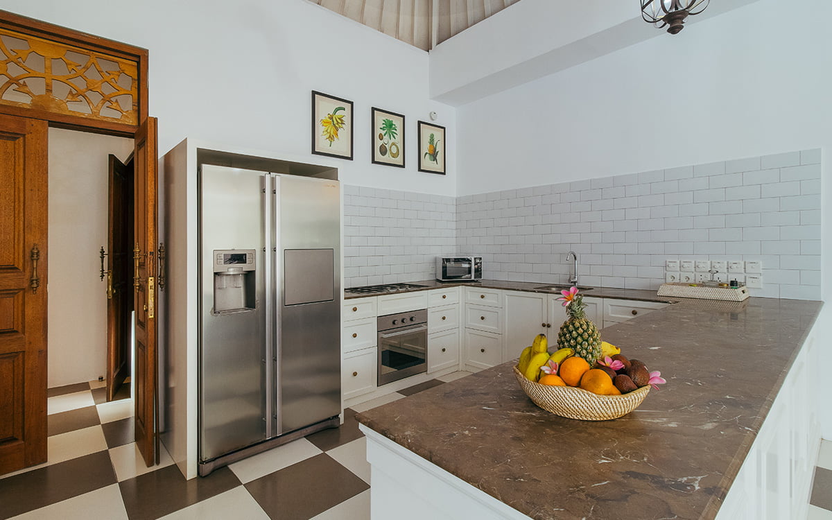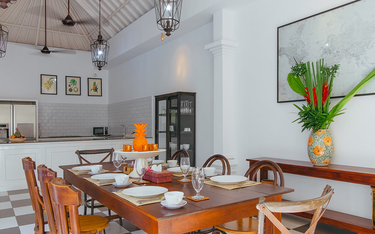 The living area runs the full length of the swimming pool. It provides very comfortable tropical living, stylish décor and furnishings, black-on-white tiled floors, and bespoke wicker furnishings you might think you’ve booked at the Raffles Hotel. A series of ceiling fans cool the area, and at night, the romantic glass chandeliers illuminate the space perfectly. At the far end, you can relax on the sofa, listen to music, use the Wi-Fi, or watch TV, which has plenty of movie and sports channels. The rustic timber dining table seats up to 8 guests, just in case you want to show off your stunning holiday villa to any visiting friends and family. The modern kitchen is fully equipped to handle all your holiday catering needs.