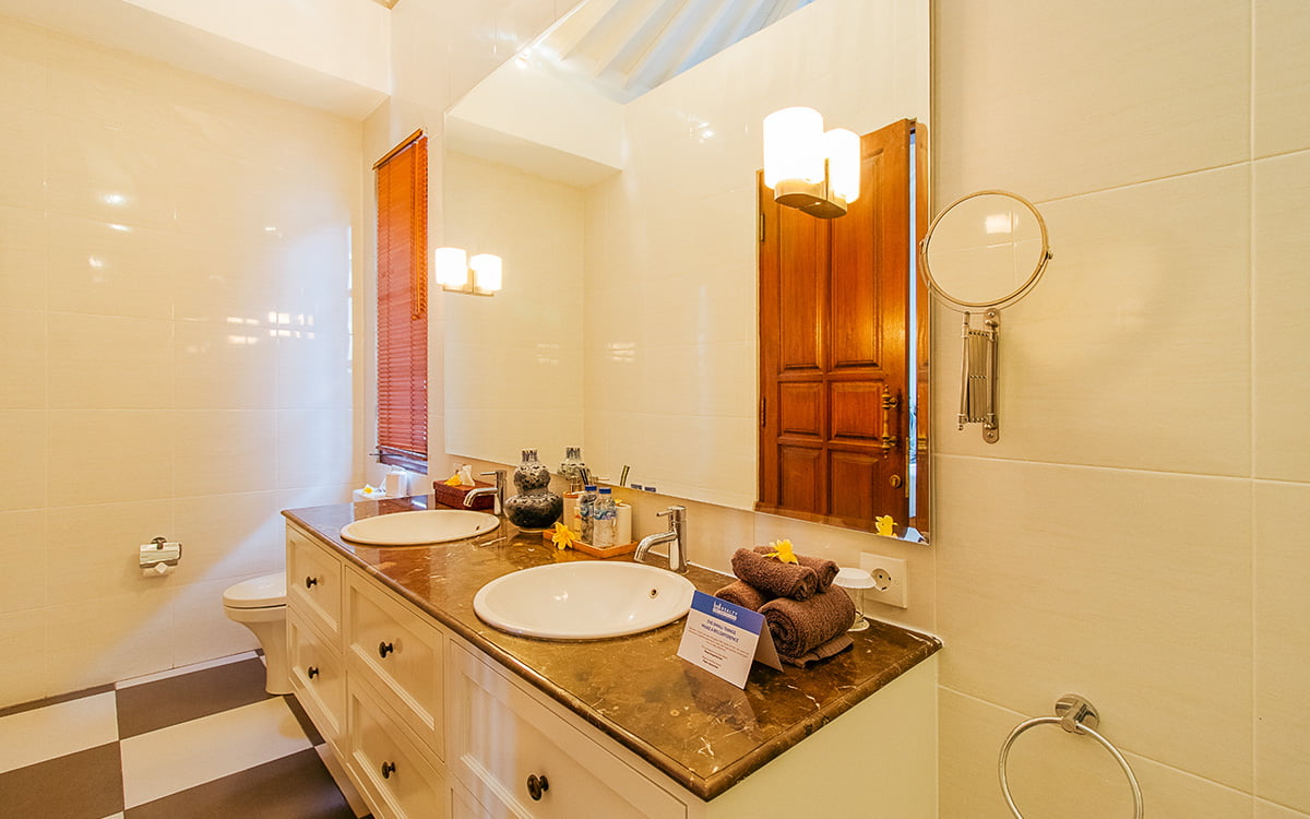 The bedrooms are simply elegant and have the same Raffles charm as the downstairs living space. The black and white tile floors play off beautifully against the clean white walls and ceilings. The upstairs bedroom has a private balcony overlooking the pool, while the downstairs room opens directly onto the pool deck. The rooms are air-conditioned and have private en-suites.