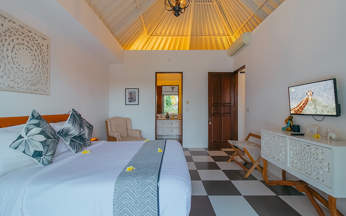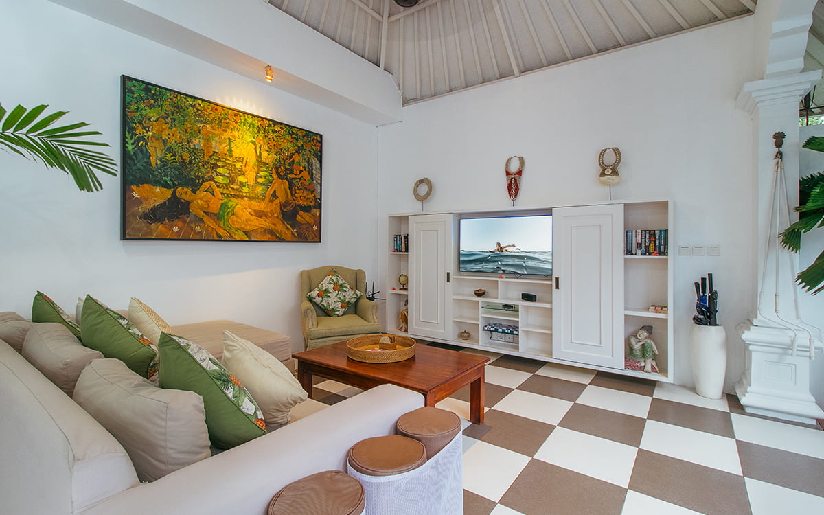 The villa has a wonderful private courtyard setting with a crystal clear water swimming pool just waiting for you to dive straight in before you unpacked your bags. The high perimeter wall is lined with lush tropical plants and flowers, and fluffy beach towels are carefully rolled on your poolside recliners, begging you to sprawl out and start working on that holiday tan you’ve been dying for.