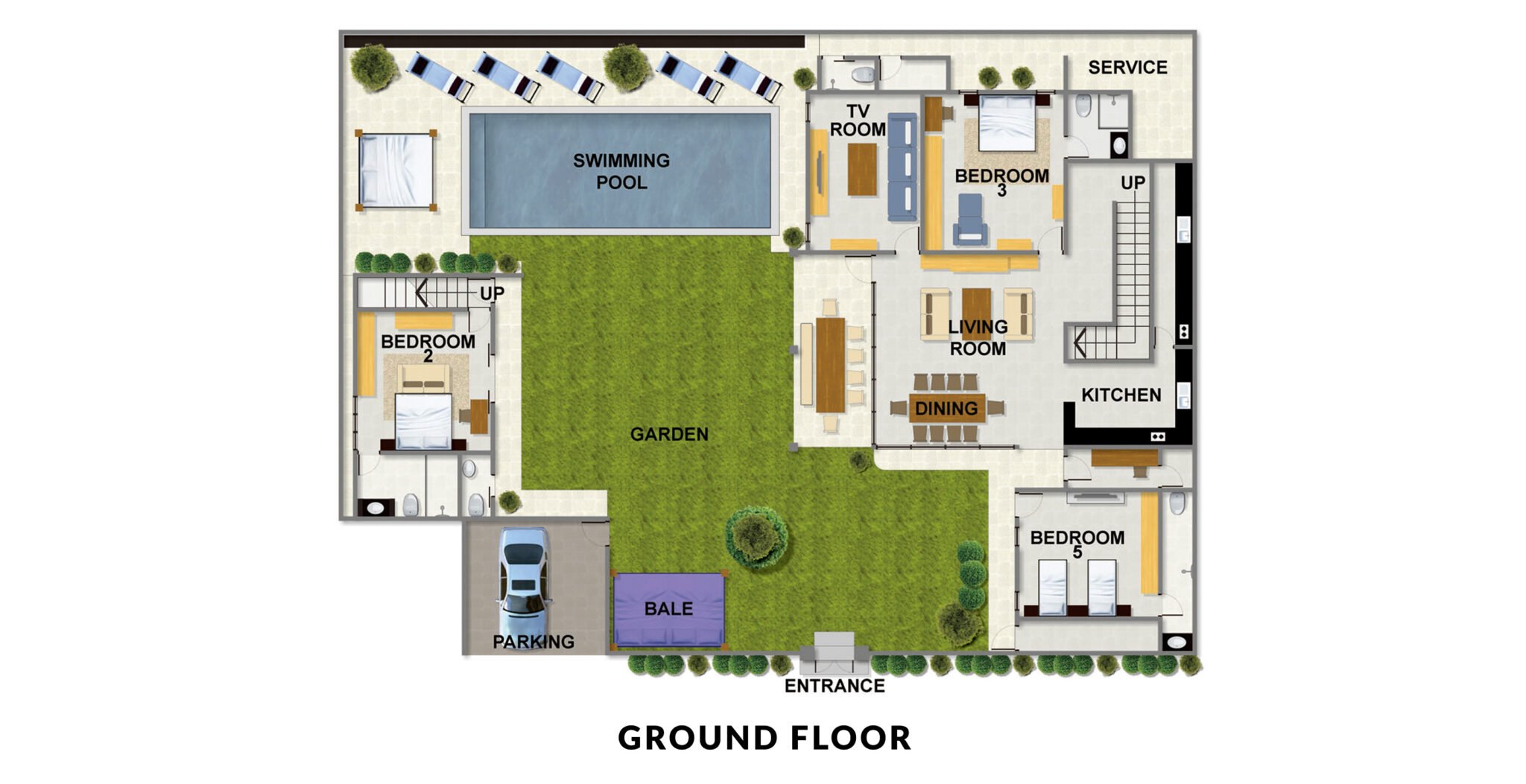 - Fabulous garden with a pool, daybeds and swings