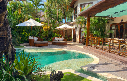 With a spectacular location right on the beachfront in Batu Belig, just a quick 10-minute drive from central Seminyak, the 5-bedroom Villa LeGa is a modern family or group-friendly villa with a fabulous swimming pool and garden area – perfect for those sunset cocktails. There’s also an entire team of in-house villa staff, including chefs, butlers, housekeepers and a villa manager, who will ensure your stay is fantastic. And yes, you are close to Cafe Del Mar beach club and all those hip cafes in Berawa and Seminyak.