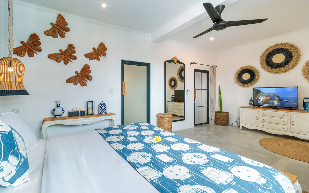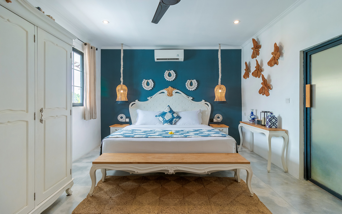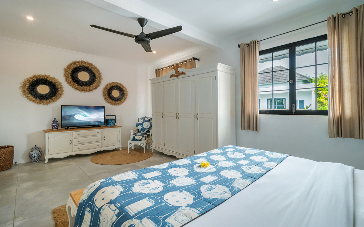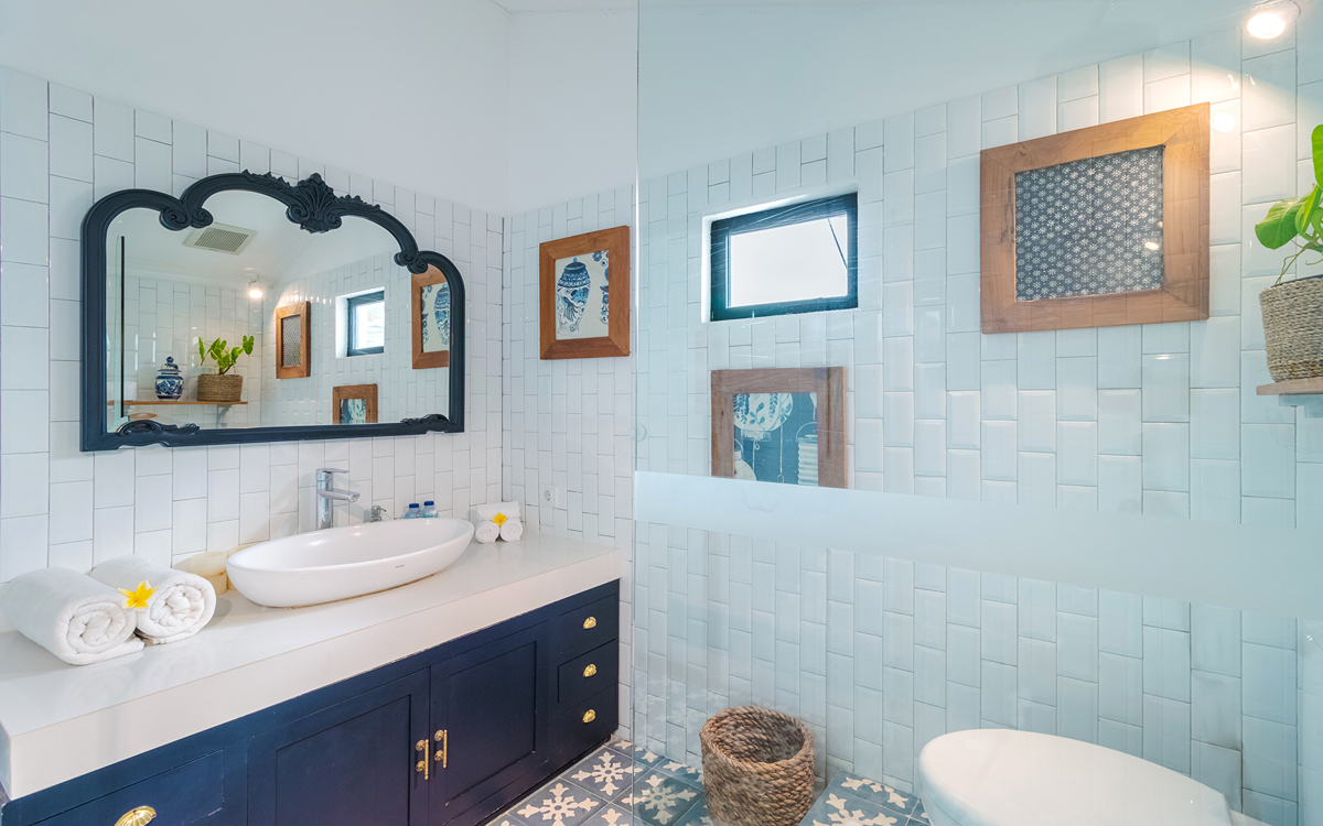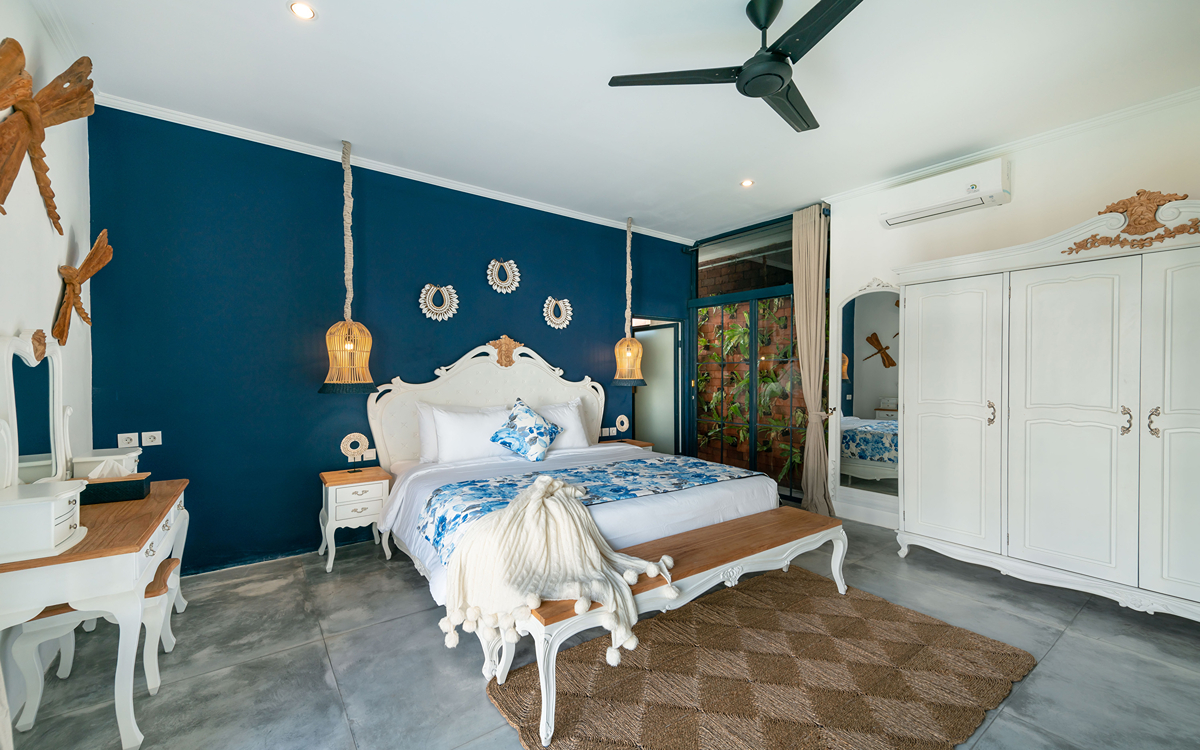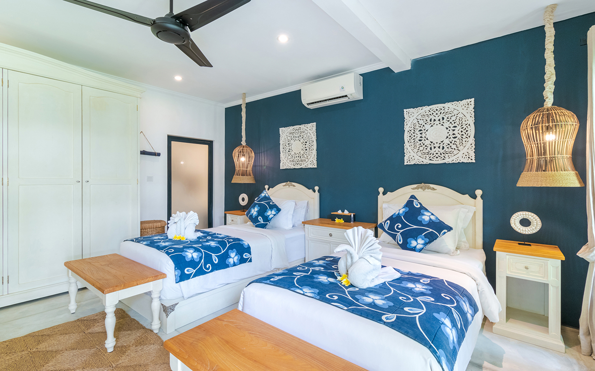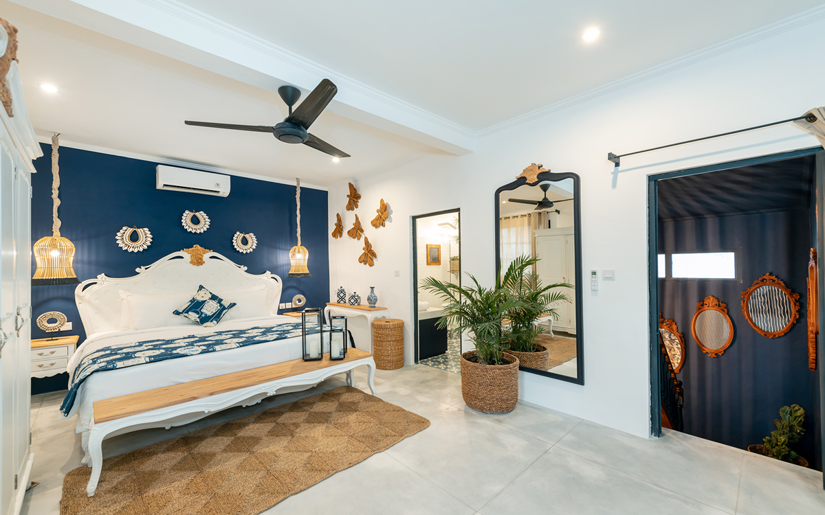 Villa Pinta Biru has 5 bedrooms. There are 2 modern master bedrooms in the main house, 2 double bedrooms in a separate building and 1 twin room adjacent to the main house (ideal for kids sharing). Each room is styled individually with unique artwork and furnishings, but all feature the same level of comfort: quality mattresses, beautiful duvets and AC. Some rooms have their smart TV for movie watching from the bed. All the rooms have spacious wardrobes and private en-suite bathrooms with rain showers. One of the master suites boasts a decadent copper bathtub.