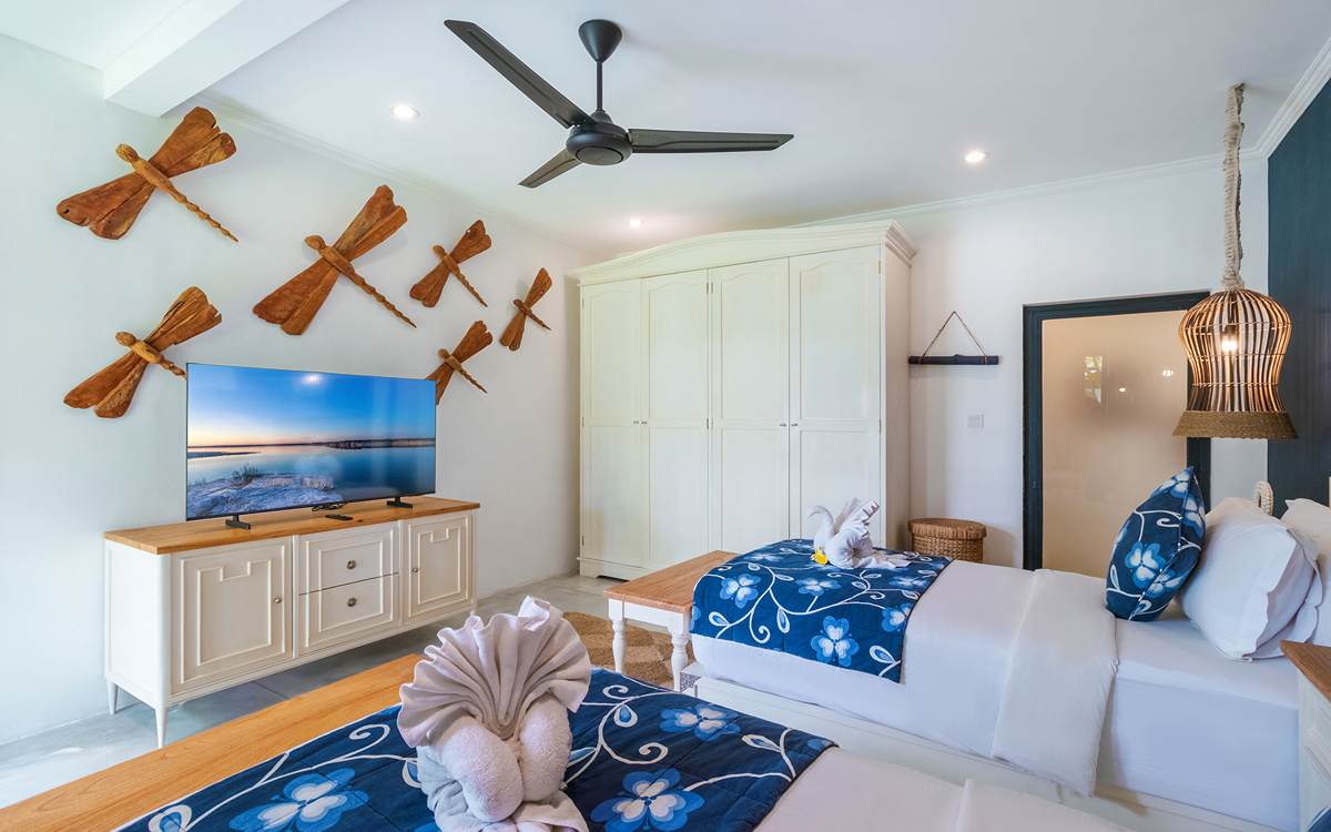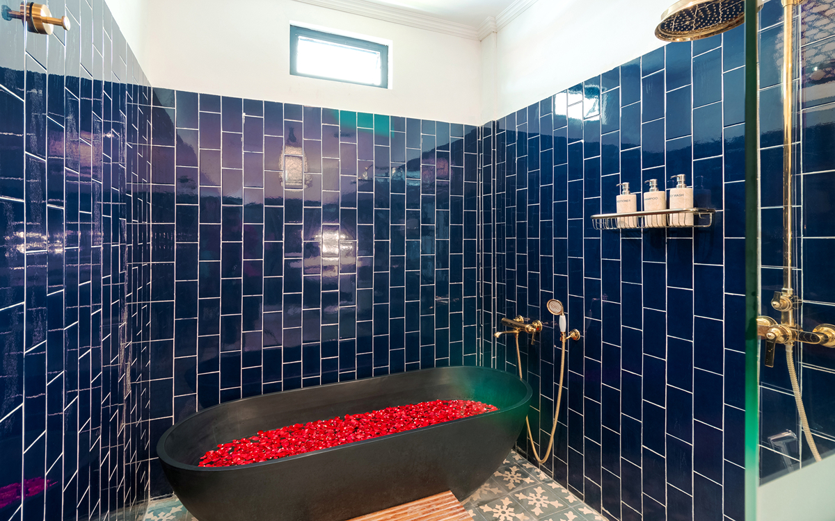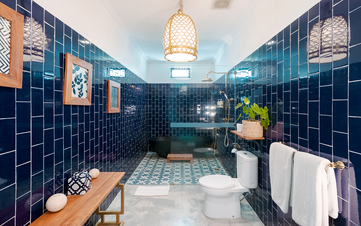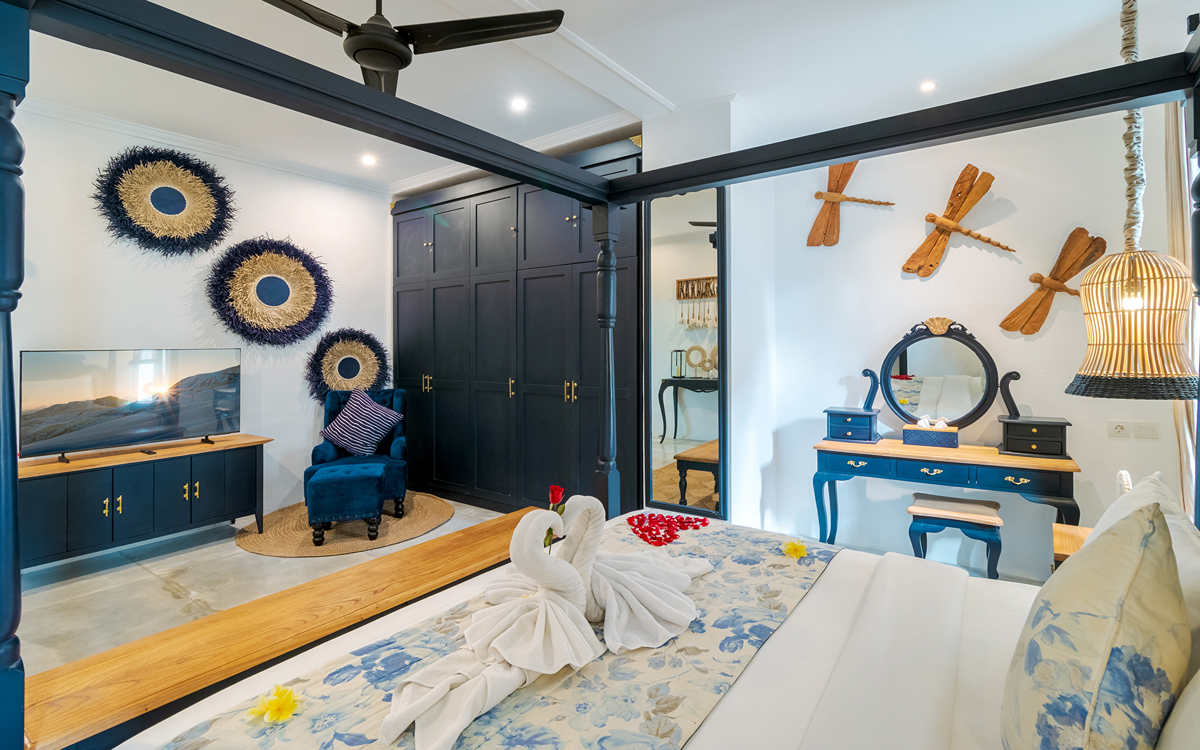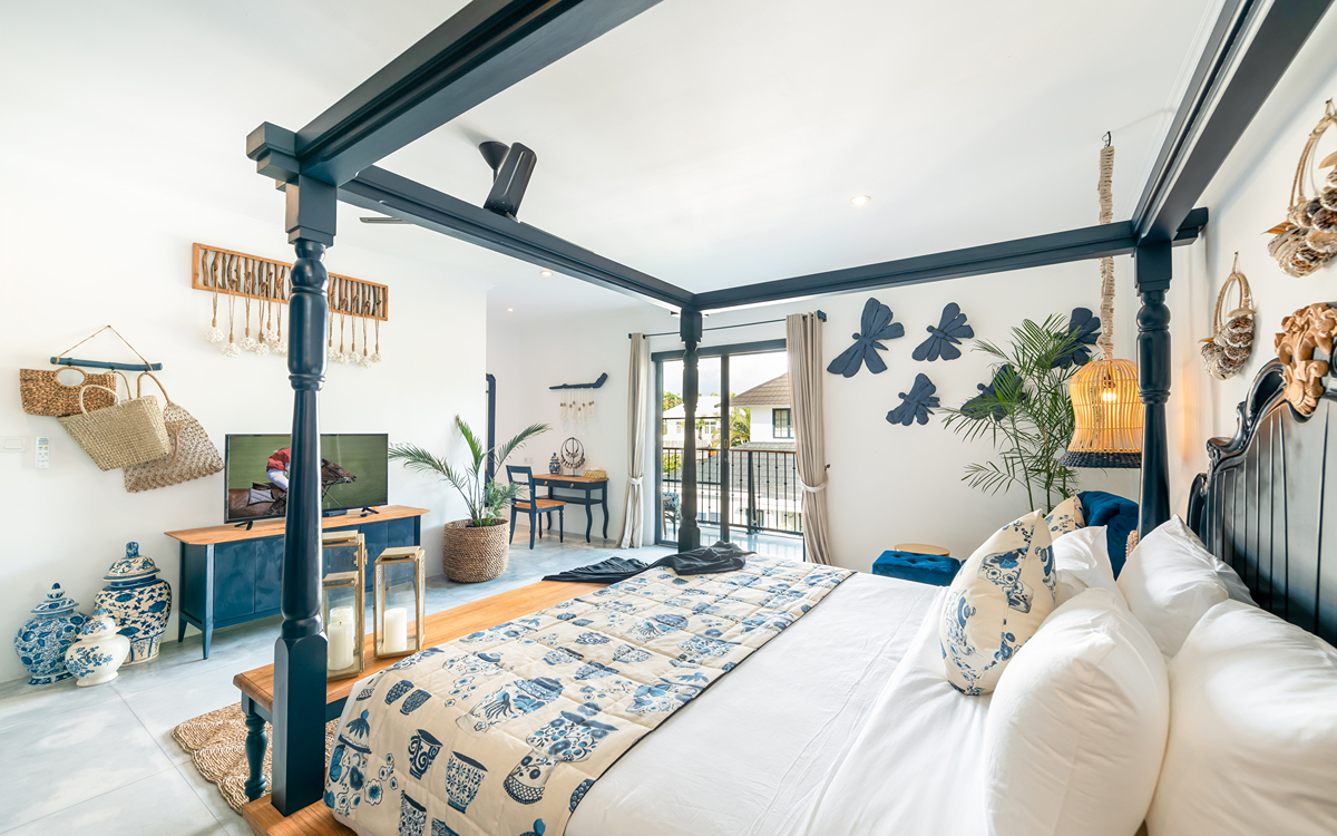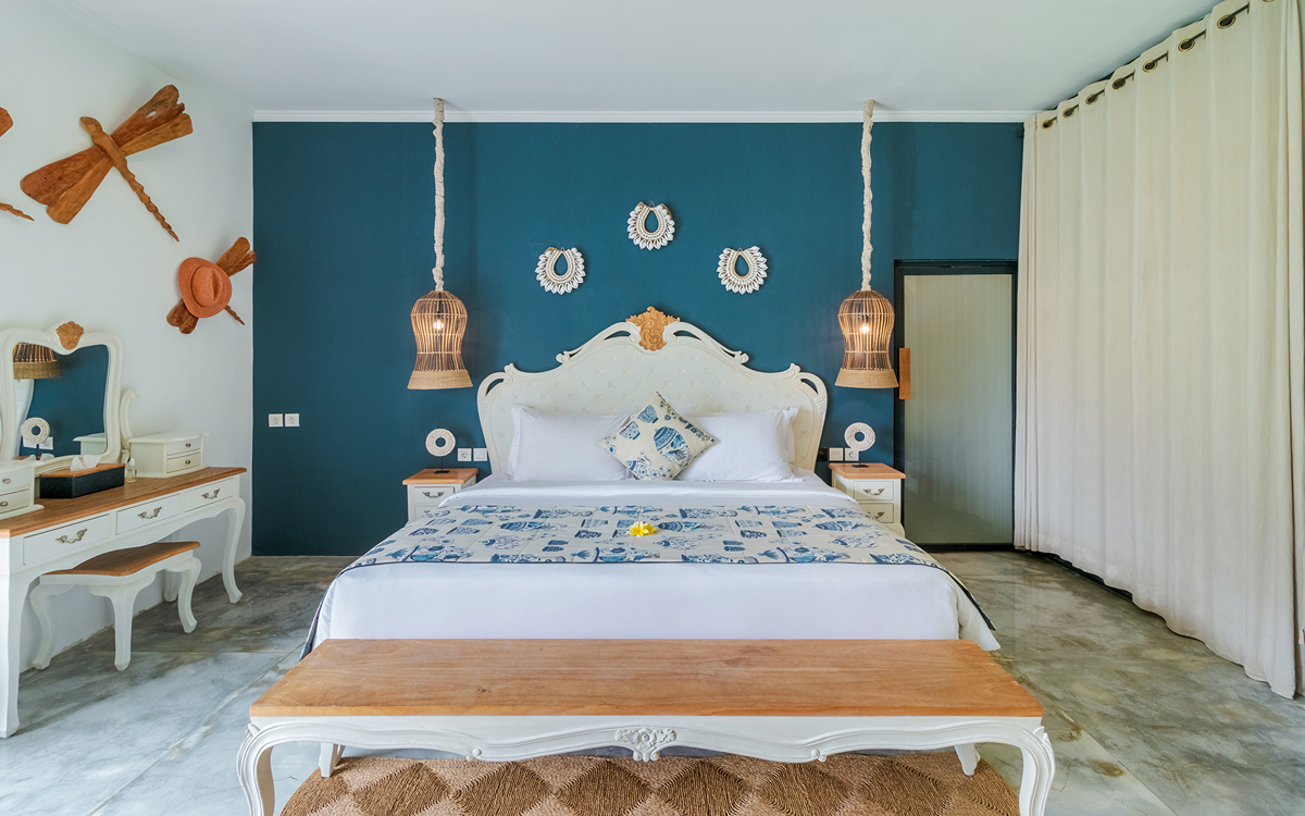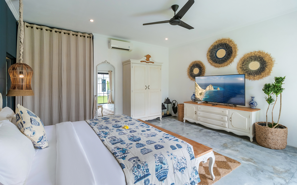 Villa Pinta Biru has 5 bedrooms. There are 2 modern master bedrooms in the main house, 2 double bedrooms in a separate building and 1 twin room adjacent to the main house (ideal for kids sharing). Each room is styled individually with unique artwork and furnishings, but all feature the same level of comfort: quality mattresses, beautiful duvets and AC. Some rooms have their smart TV for movie watching from the bed. All the rooms have spacious wardrobes and private en-suite bathrooms with rain showers. One of the master suites boasts a decadent copper bathtub.