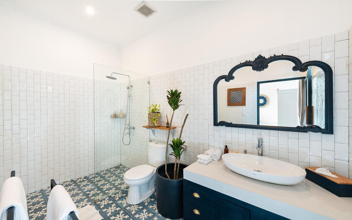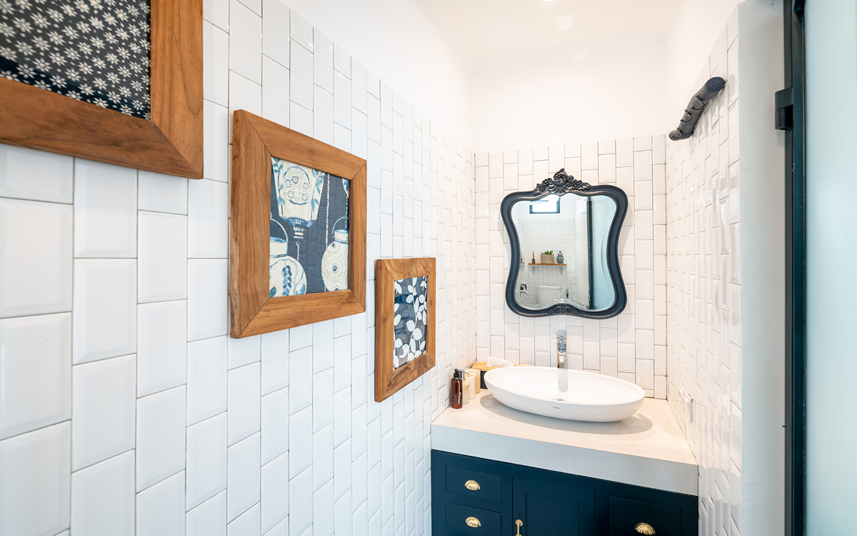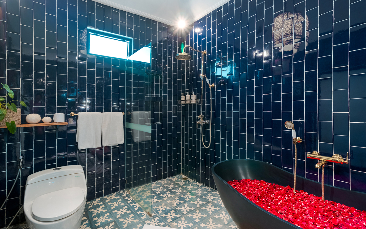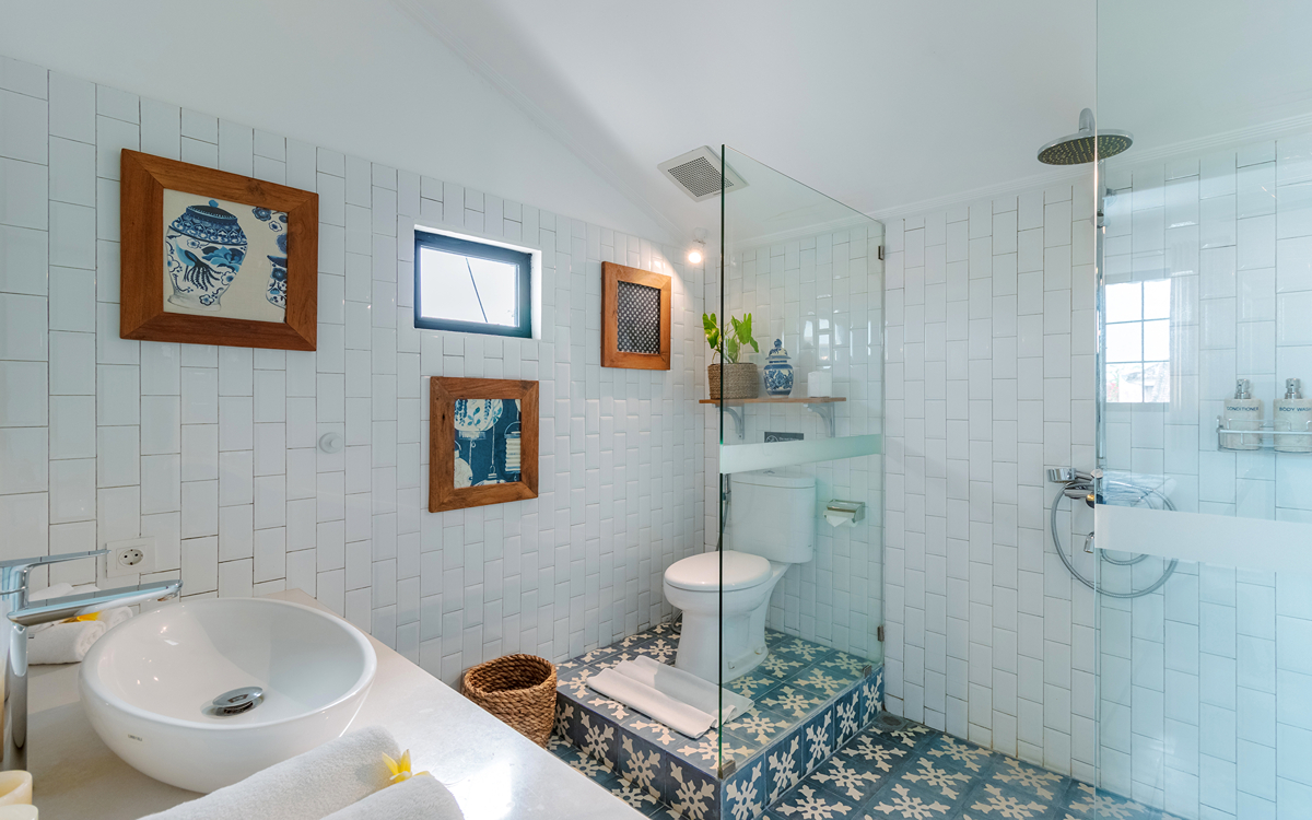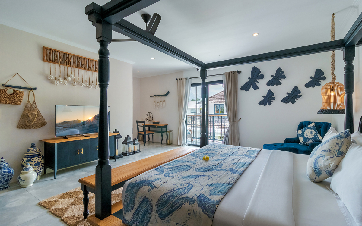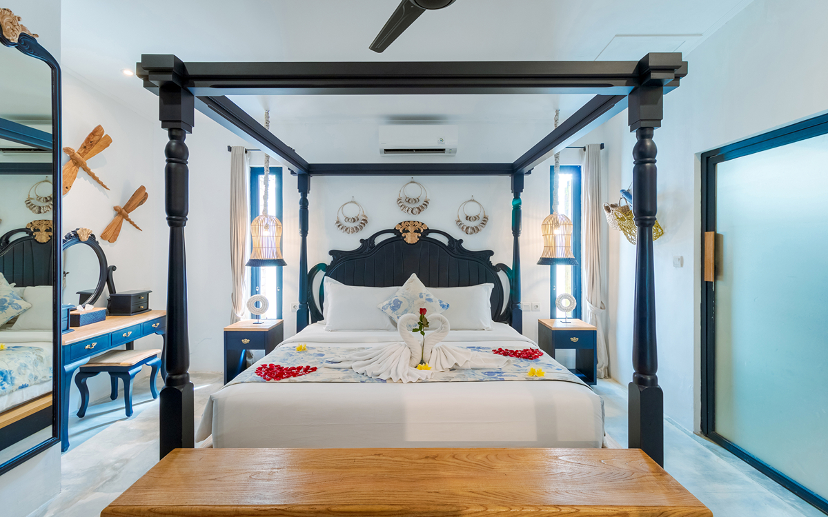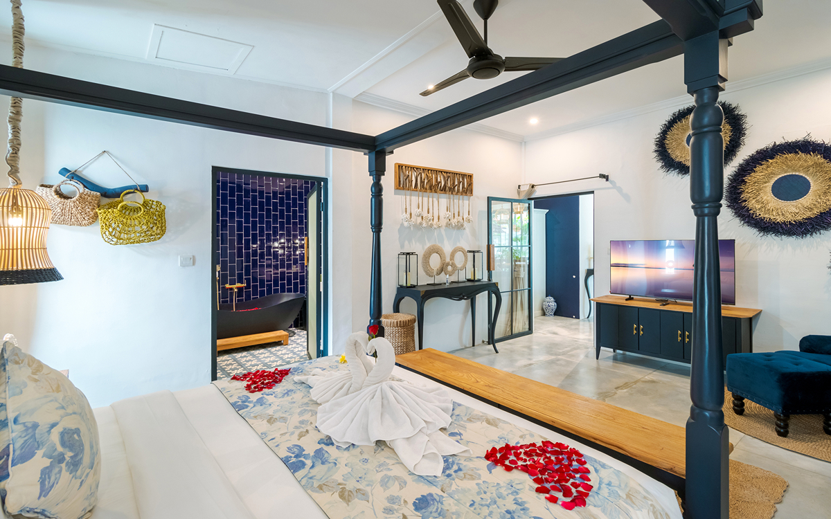 Villa Pinta Biru has 5 bedrooms. There are 2 modern master bedrooms in the main house, 2 double bedrooms in a separate building and 1 twin room adjacent to the main house (ideal for kids sharing). Each room is styled individually with unique artwork and furnishings, but all feature the same level of comfort: quality mattresses, beautiful duvets and AC. Some rooms have their smart TV for movie watching from the bed. All the rooms have spacious wardrobes and private en-suite bathrooms with rain showers. One of the master suites boasts a decadent copper bathtub.
