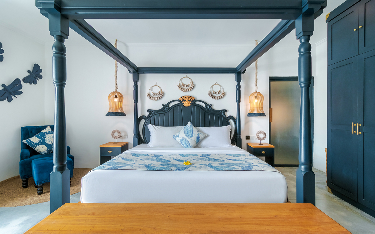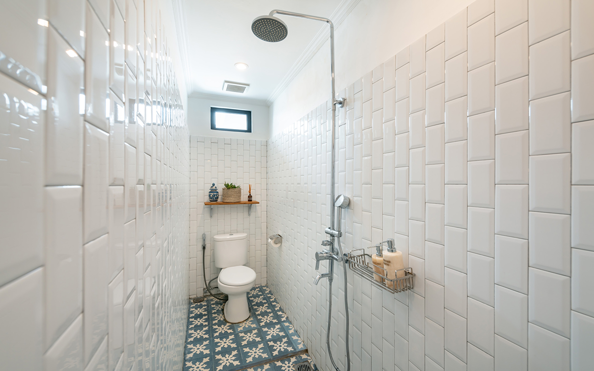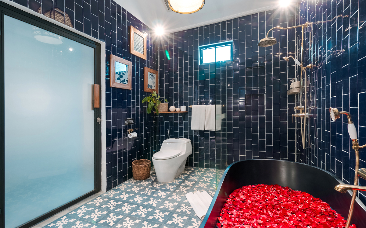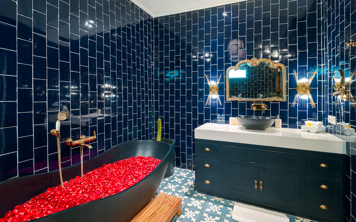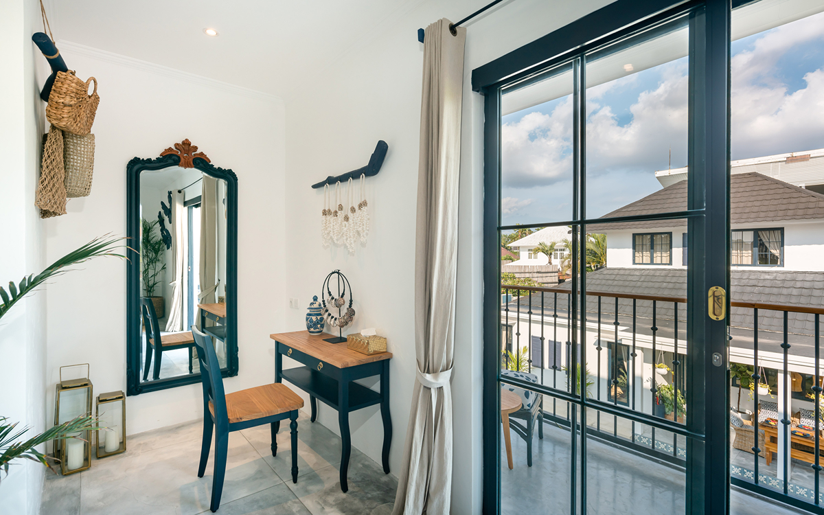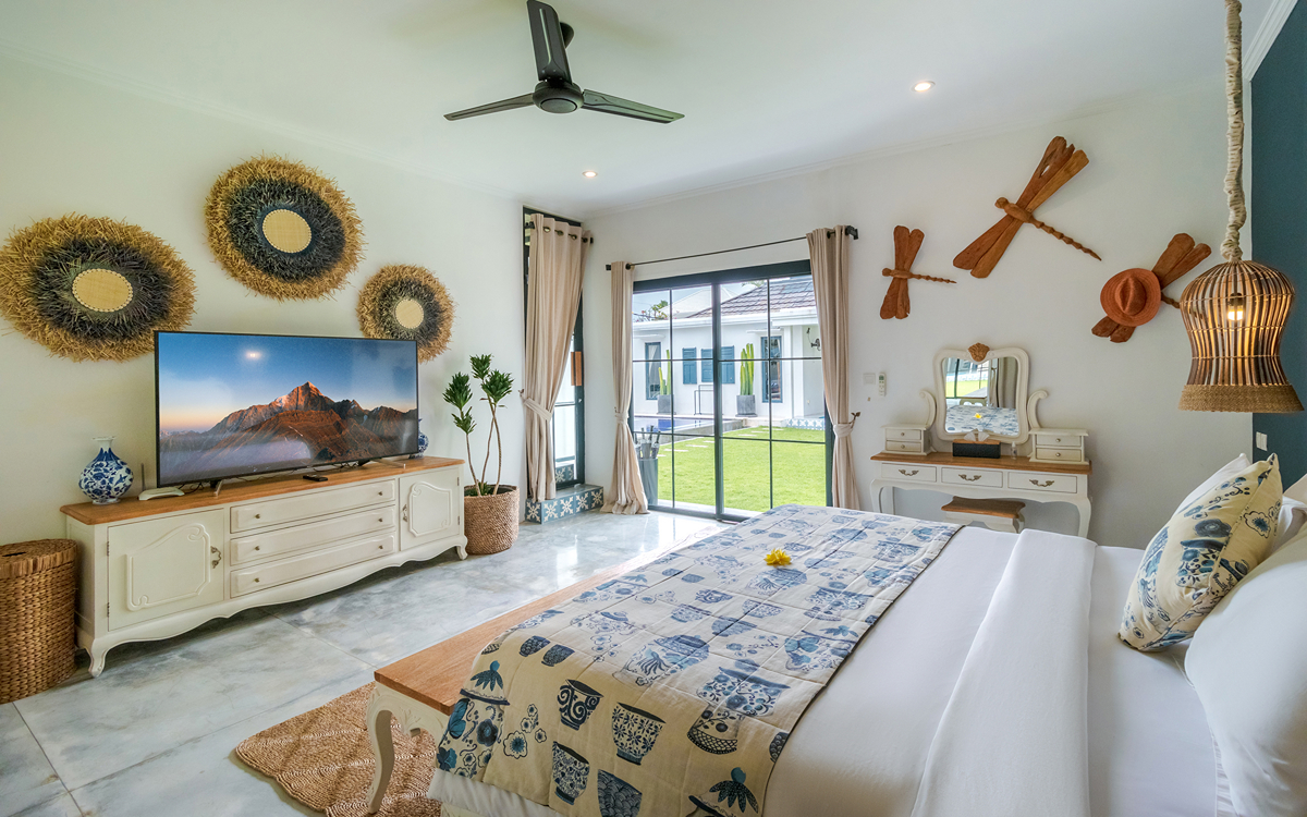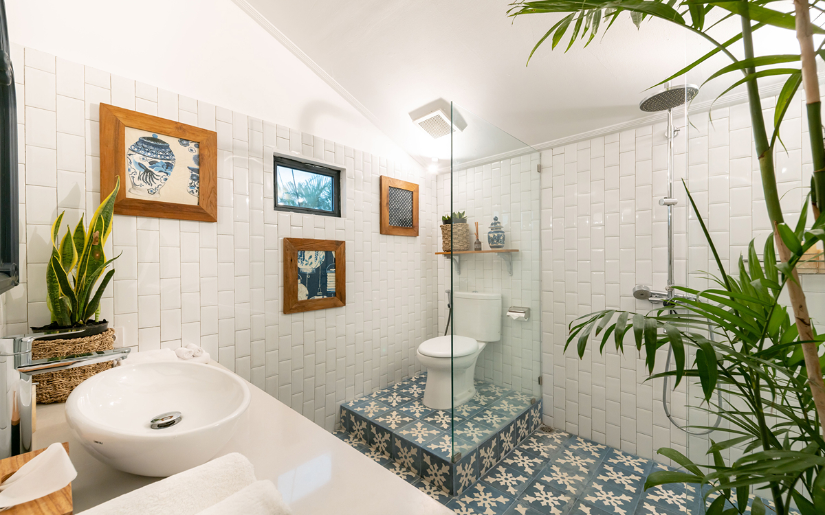 Villa Pinta Biru has 5 bedrooms. There are 2 modern master bedrooms in the main house, 2 double bedrooms in a separate building and 1 twin room adjacent to the main house (ideal for kids sharing). Each room is styled individually with unique artwork and furnishings, but all feature the same level of comfort: quality mattresses, beautiful duvets and AC. Some rooms have their smart TV for movie watching from the bed. All the rooms have spacious wardrobes and private en-suite bathrooms with rain showers. One of the master suites boasts a decadent copper bathtub.