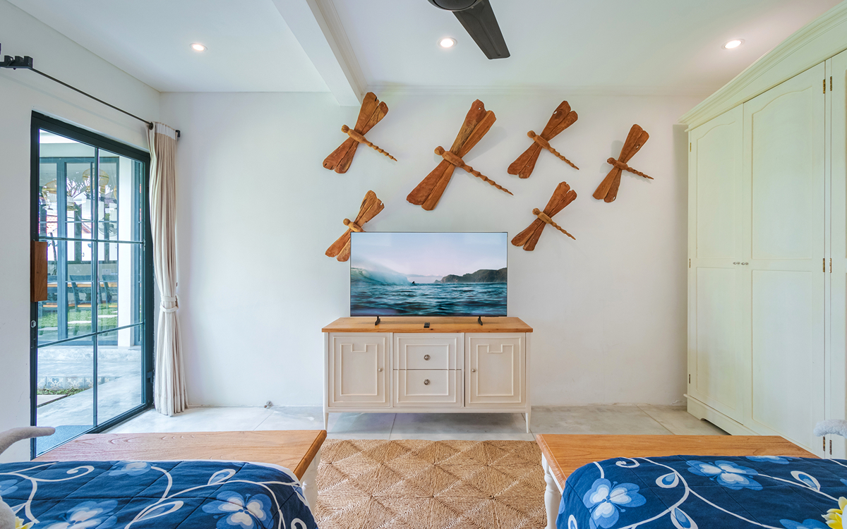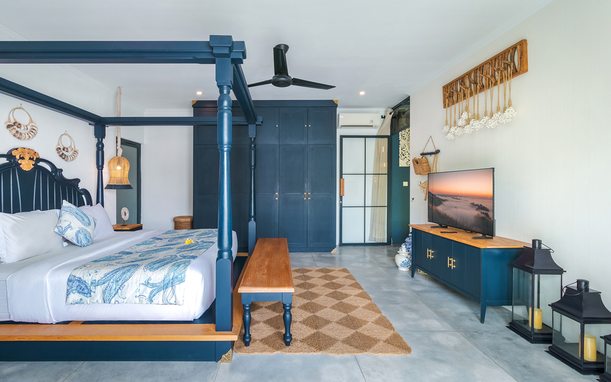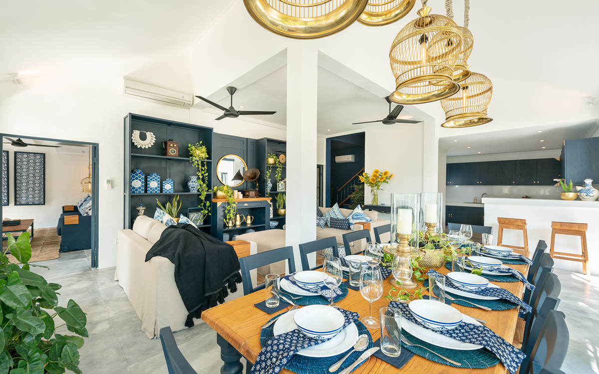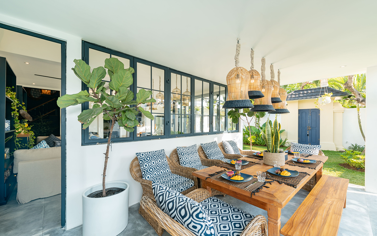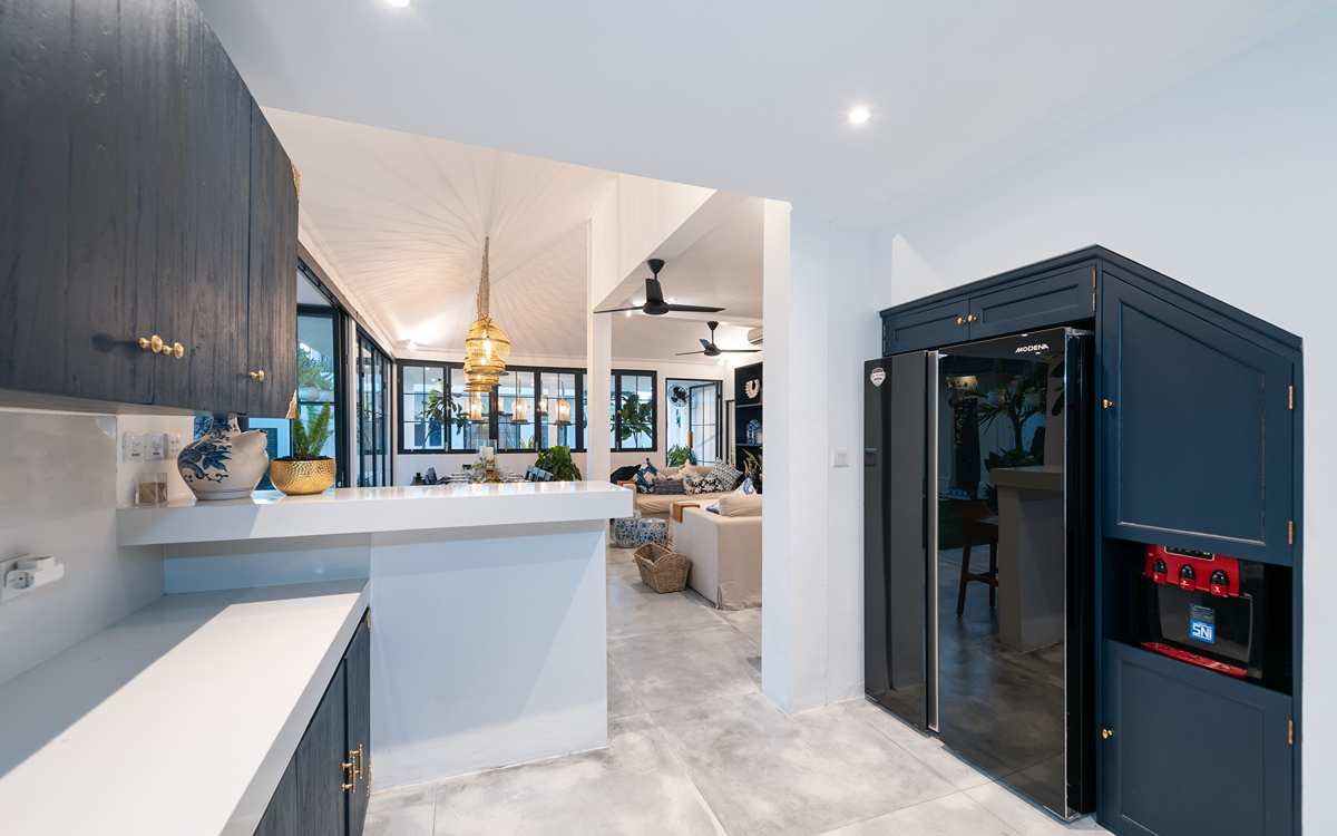 Villa Pintu Biru features eclectic, tropical-chic interiors with tribal art and exotic textiles. There are comfortable sofas, a 10-seater dining table, and a modern kitchen with a bar and high chairs. Did we mention the living room is equipped with air-conditioning, too? If you’re up for a lazy evening staying inside the villa and watching a movie, you will love the separate air-conditioned media room with a 120-inch Smart TV.