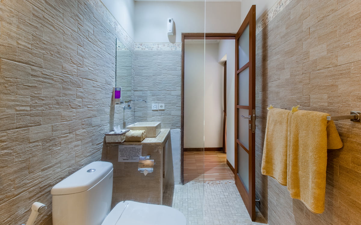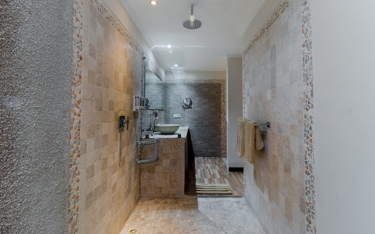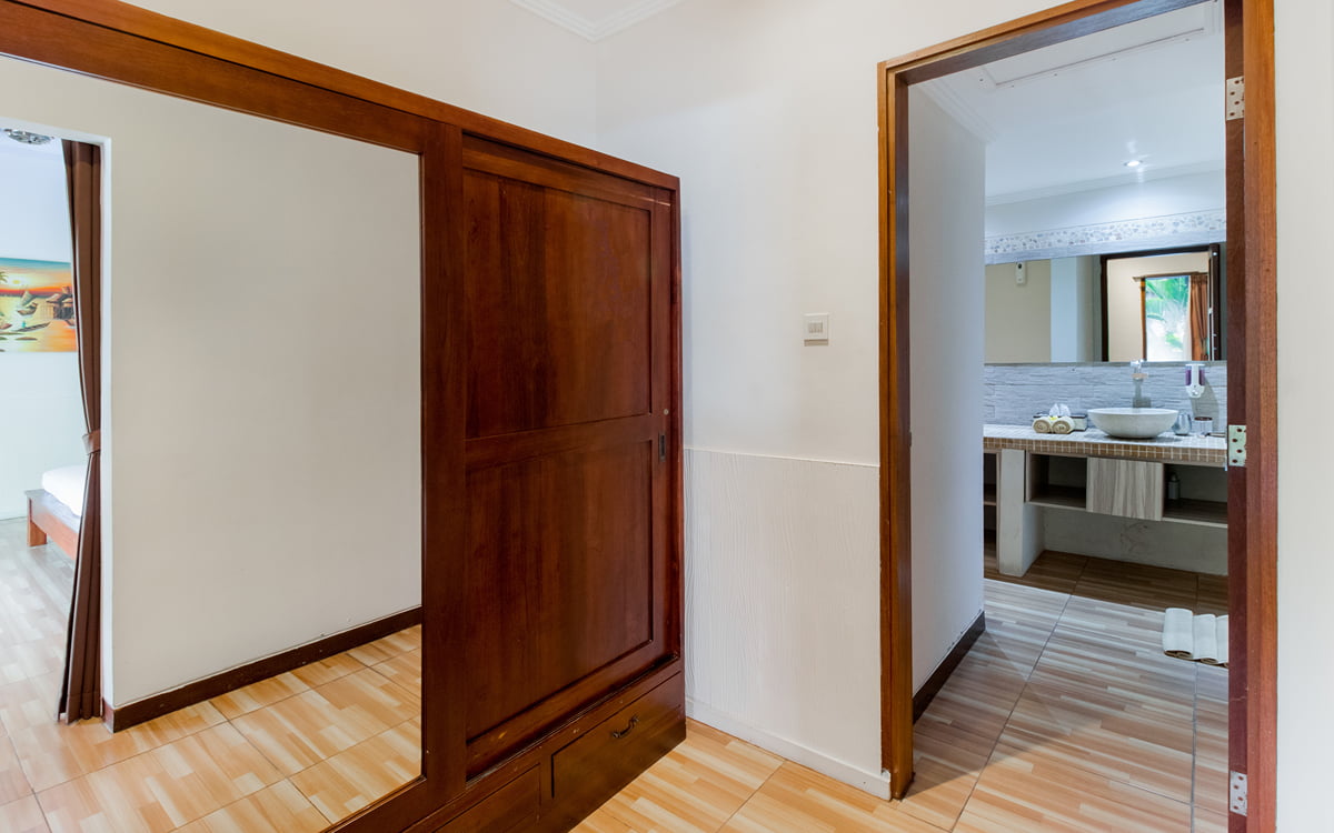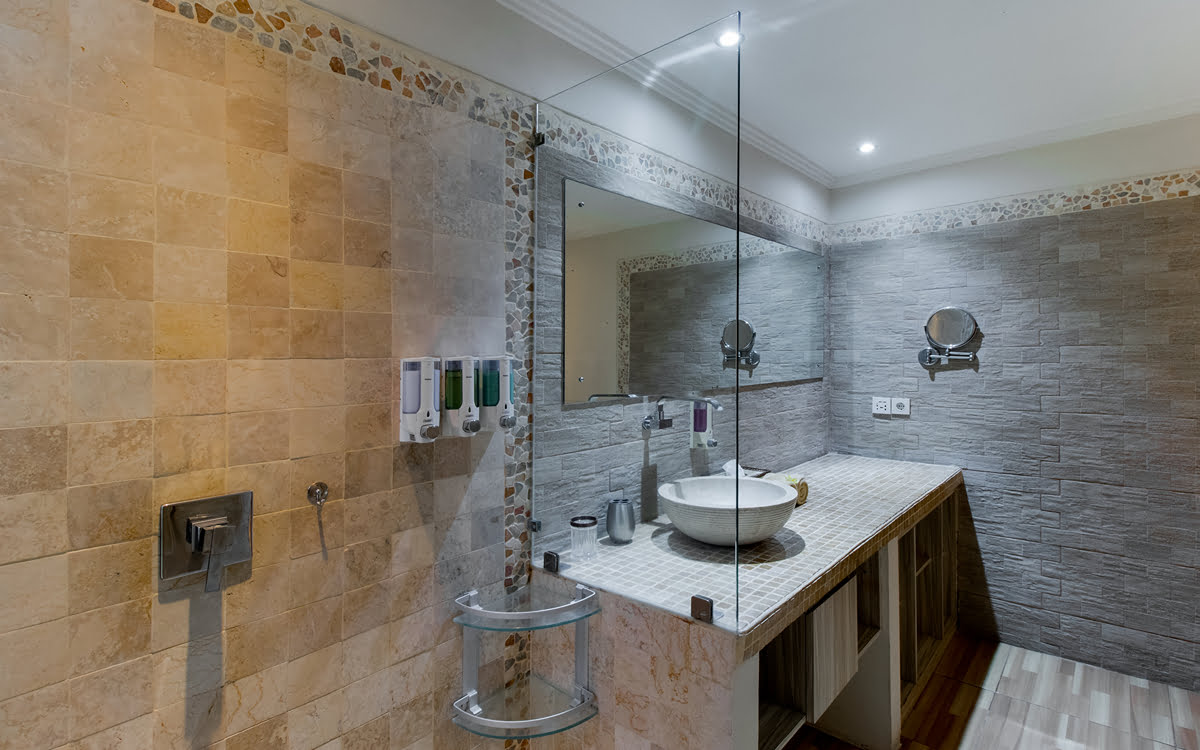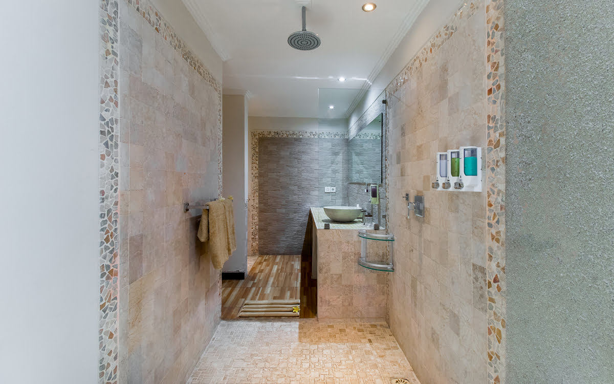 This modern villa has 3 large bedrooms, each with its own private ensuite bathroom. Two bedrooms come with king-size double beds with lots of storage space; each bedroom has a private dressing area with a large wardrobe. The third bedroom has two single beds (great for travelling with kids who can share a room), and all rooms are air-conditioned. All the bedrooms have views of the pool. All bedrooms have safes fitted for your valuables, etc.