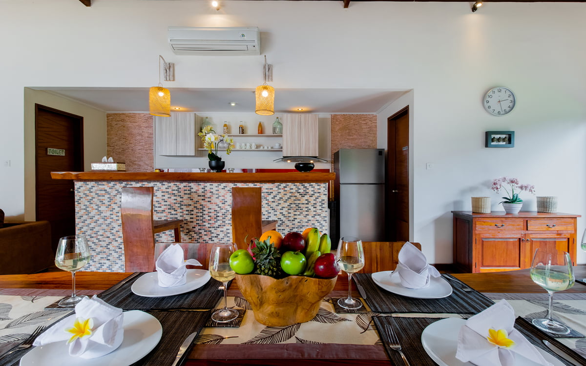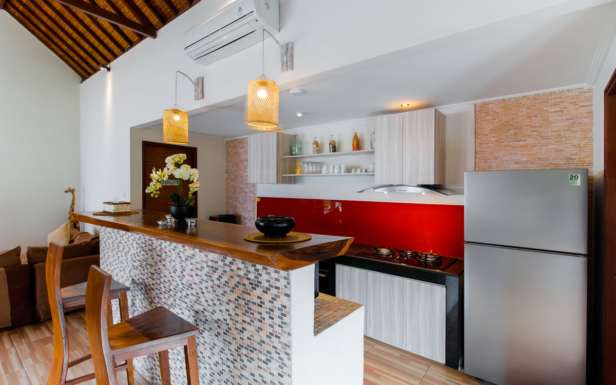The living area has a modern sofa where everyone can gather and relax before exploring Seminyak. Large bi-fold doors open out to provide views of the pool, where you can watch the kids play. There’s also a fully equipped kitchen with a large fridge to stock up on all your villa supplies, beers and wines.