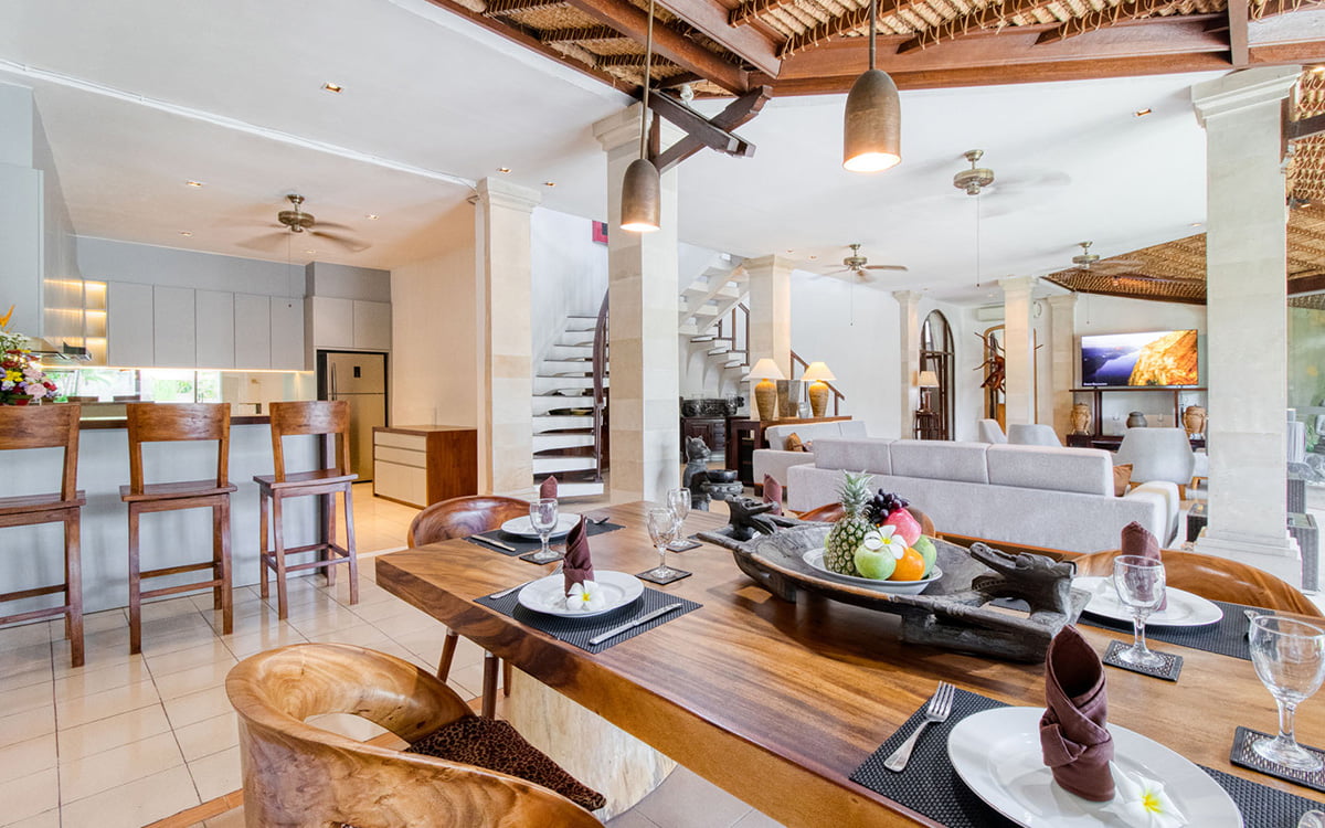 The living and dining areas in Villa Matahari are very spacious and have an open-plan design, allowing the tropical Bali breeze and sunlight to pour into the villa. There are comfy couches and dining where everyone can gather and relax and enjoy meals together. If you feel like cooking, there’s a fully equipped kitchen, but if you prefer, the villa staff can prepare meals for you and your family.