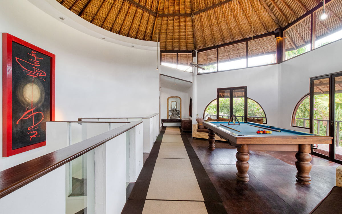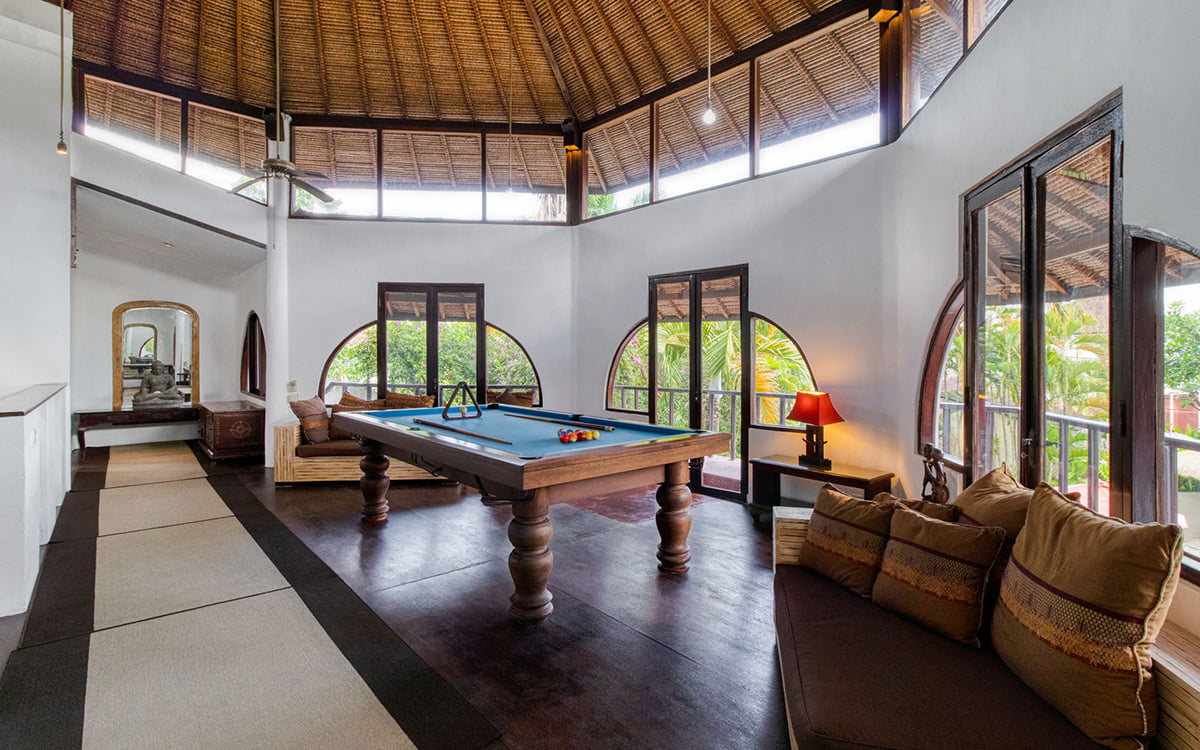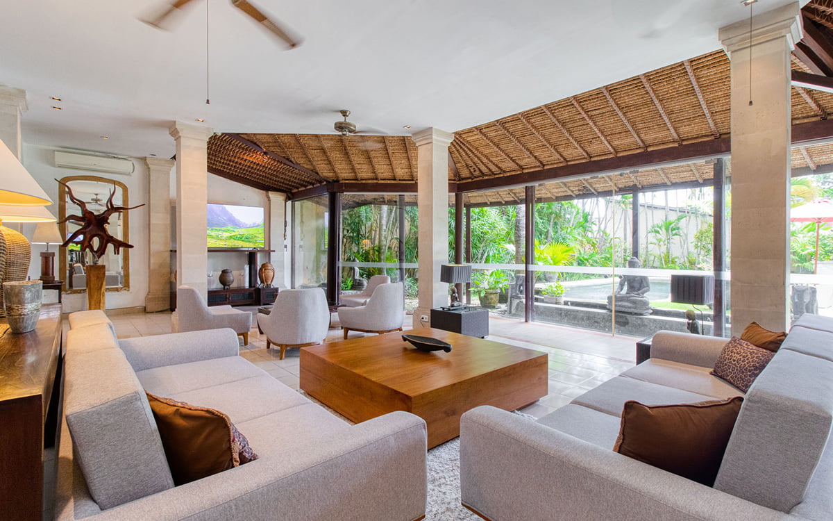 The villa has a 14-metre swimming pool (perfect for a family with kids) with sun loungers to relax or chill out in the afternoon with a couple of Bintangs. The living area opens so you can see the kids playing in the pool.