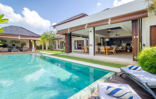 Bring the whole family and enjoy Villa Tibu Indah, a 3-bedroom tropical holiday villa rental near Canggu’s popular cafes, day spas and beach clubs. Three separate Bali-style pavillion house modern, fully air-conditioned bedrooms and luxe en-suite bathrooms, a sunny swimming pool and in-house villa staff; this is a fantastic villa where you can unwind and completely relax.