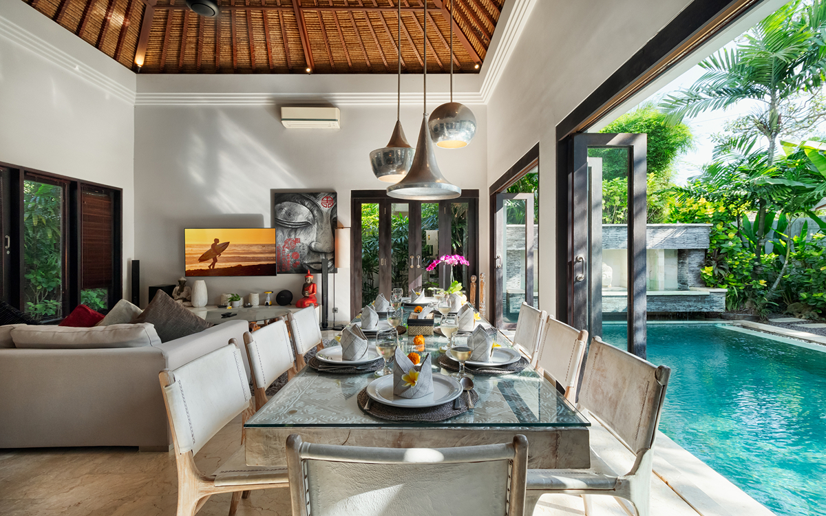 The outdoor setting is ideal for friends and family to enjoy each other’s company around the pool. Natural river stones, calming Buddhas, tropical greenery, and frangipani trees create an authentic Balinese vibe. Sit back on the sun lounges under the parasol’s shade and completely unwind in this Balinese paradise.